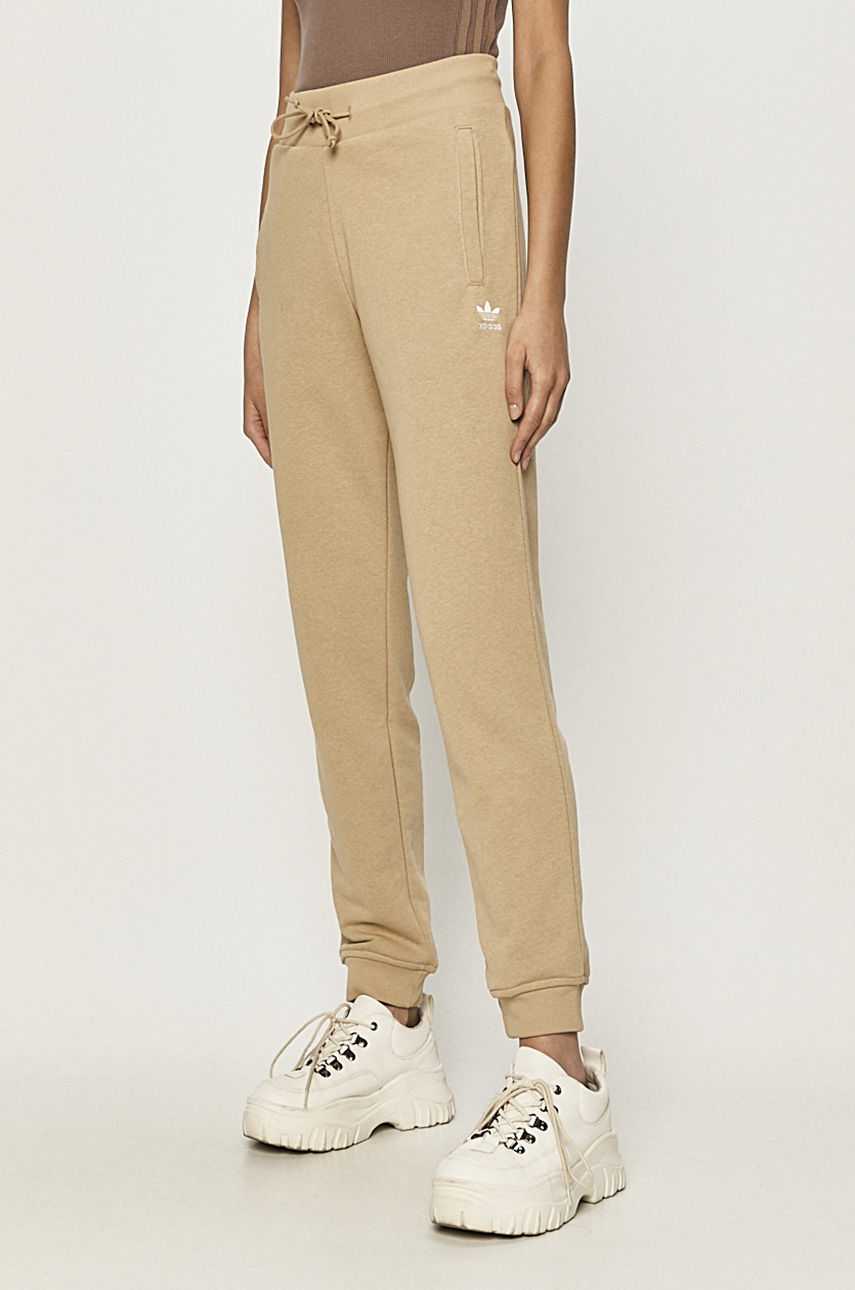 Spodnie z kolekcji adidas Originals. Model wykonany z gładkiej dzianiny. – Elastyczna listwa w pasie. – W pasie troczki. – Nogawki wykończone ściągaczem. – Wsuwane kieszenie. – Szerokość w pasie: 37 cm. – Szerokość w biodrach: 52 cm. – Wysokość stanu: 29 cm. – Szerokość nogawki na dole: 14 cm. – Szerokość nogawki: 30 cm. – Długość: 99 cm. – Wymiary podane dla rozmiaru: 36. Wzór: aplikacja Materiał: dzianina Skład: Materiał zasadniczy: 70 % Bawełna, 30 % Poliamid z recyklingu, Ściągacz: 95 % Bawełna, 5 % Elastan ID produktu: 4900-SPD08W Kod producenta: GD4298