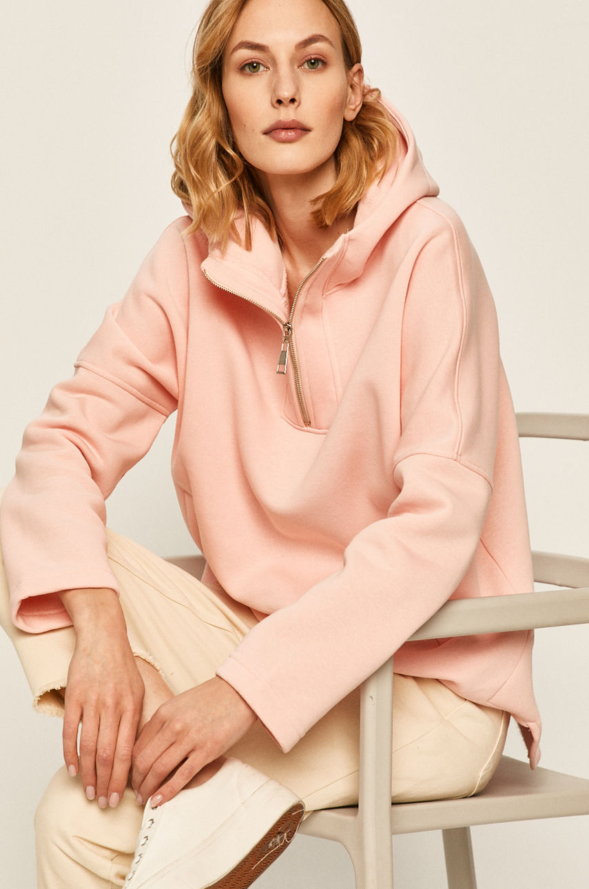 Bluza z kapturem z kolekcji Answear. Model wykonany z gładkiej dzianiny. – Krótkie zapięcie na suwak. – Model z kapturem. – Obniżona linia ramion. – Luźny fason. Wzór: gładkie Materiał: z elastanem Kaptur: z kapturem Skład: 95 % Bawełna, 5 % Elastan ID produktu: -100-BLD619 Kod producenta: WS20.BLD619