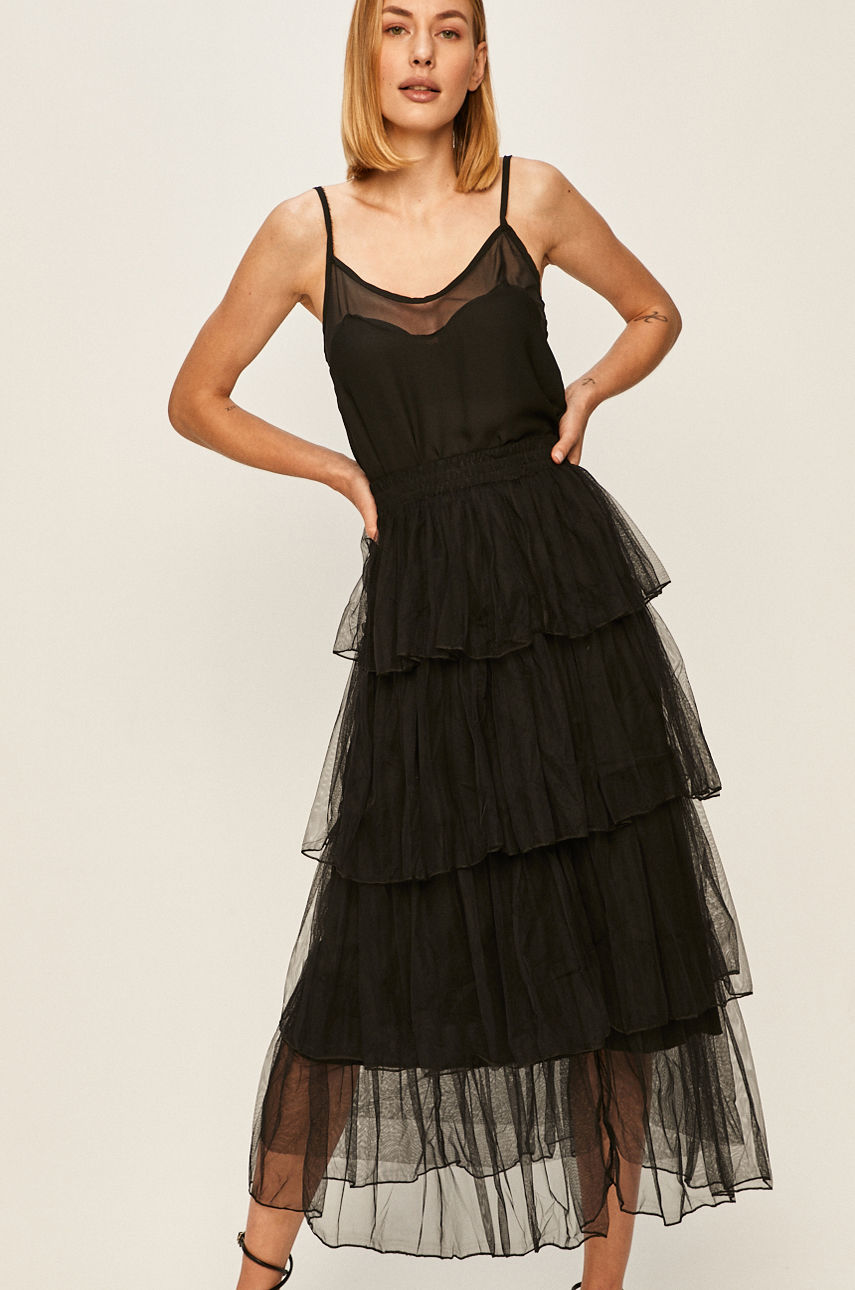 Spódnica z kolekcji Answear. Model o rozkloszowanym kroju, wykonany z tiulowego materiału. – Rozkloszowany fason. – Podwyższony stan. – Elastyczna listwa w pasie. – Cienki materiał. – Model na podszewce. – Model z ozdobnymi falbanami. – Szerokość w pasie: 28,5 cm. – Długość: 91 cm. – Wymiary podane dla rozmiaru: S. Wzór: gładkie Materiał: dzianina Długość: maxi Okazje: casual Fason: rozkloszowany Okazje: koktajl Skład: 100 % Poliester ID produktu: -100-SDD00I Kod producenta: 1503.J