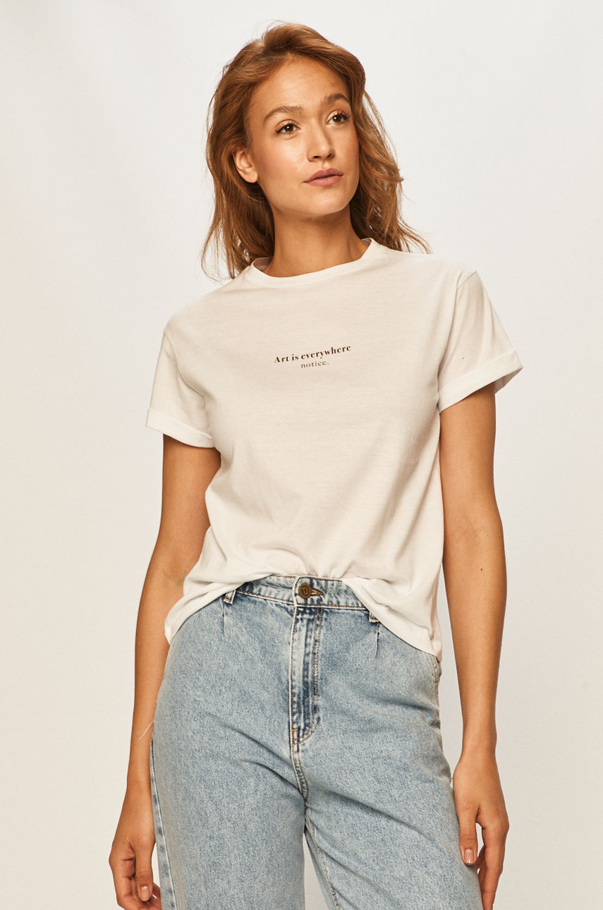 T-shirt z kolekcji Answear. Model wykonany z lekko elastycznej dzianiny. – Okrągły dekolt. – Prosty fason. – Model z nadrukiem. – Długość: 59 cm. – Szerokość pod pachami: 49 cm. – Wymiary podane dla rozmiaru: S. Wzór: nadruk Dekolt: okrągły Materiał: bawełna Okazje: casual ID produktu: -100-TSD03J Kod producenta: SONG.106.NNJ