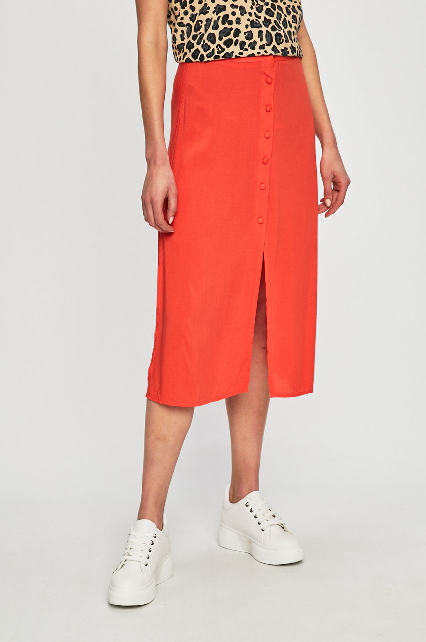 Spódnica z kolekcji Answear. Model o prostym kroju, wykonany z gładkiej tkaniny. – Prosty fason. – Podwyższona talia. – Zapięcie na guziki. – Cienka, nieelastyczna tkanina. – Szerokość w pasie: 35,5 cm. – Długość: 74,5 cm. – Wymiary podane dla rozmiaru: S. Wzór: gładkie Materiał: tkanina Długość: midi Materiał: wiskoza Fason: rozkloszowany Skład: 100 % Wiskoza, ID produktu: -90-SDD01R Kod producenta: LSKW333LYNN.V