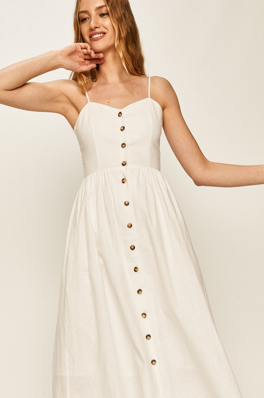 Lekka sukienka z kolekcji Answear. Prosty model wykonany z gładkiej tkaniny. – Prosty fason. – Spiczasty dekolt. – Zapięcie na guziki. – Regulowane ramiączka. – Gładka tkanina. – Długość: 113 cm. – Szerokość pod pachami: 40 cm. – Wymiary podane dla rozmiaru: XS. Wzór: gładkie Rękaw: na ramiączkach Dekolt: szpic Długość: midi Materiał: bawełna Okazje: casual Fason: prosty Skład: 100 % Bawełna ID produktu: -100-SSD02E Kod producenta: HAK.141.G