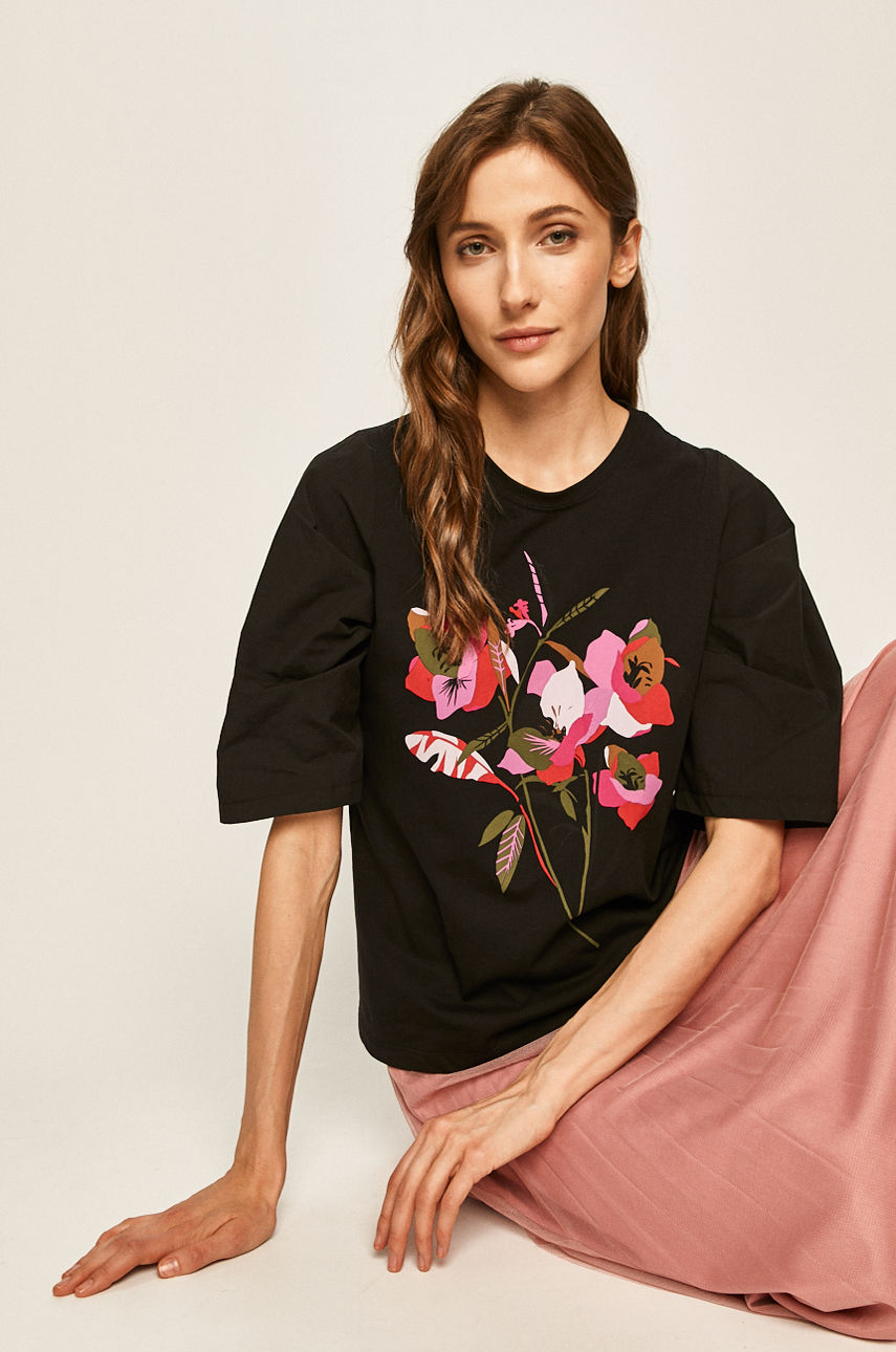 T-shirt z kolekcji Answear. Model wykonany z dzianiny z nadrukiem. – Prosty fason. – Okrągły dekolt. – Cienka, elastyczna dzianina. – Model z nadrukiem. – Długość: 59 cm. – Szerokość pod pachami: 44 cm. – Wymiary podane dla rozmiaru: S. Wzór: nadruk Dekolt: okrągły Materiał: bawełna Okazje: casual Skład: 100 % Bawełna ID produktu: -100-TSD07M Kod producenta: 4573.FAM