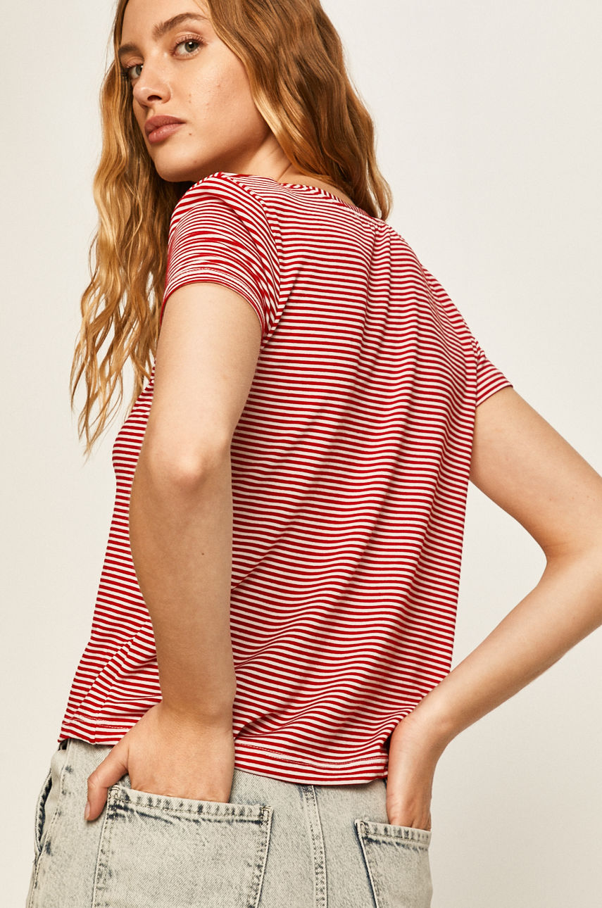 T-shirt z kolekcji Answear. Model wykonany z cienkiej, elastycznej dzianiny. – Prosty fason. – Spiczasty dekolt. – Cienka, elastyczna dzianina. – Szerokość pod pachami: 44 cm. – Długość: 54 cm. – Wymiary podane dla rozmiaru: S. Wzór: wzorzyste Dekolt: szpic Wzór: pasy Materiał: bawełna Okazje: casual Skład: 100 % Bawełna ID produktu: -100-TSD0AR Kod producenta: WZ20.TSD0AR