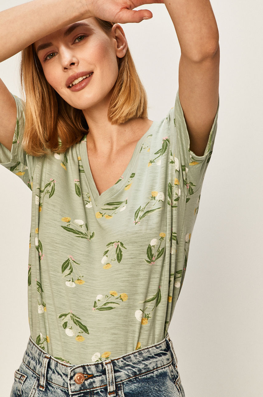 Lekki T-shirt z kolekcji Answear. Model wykonany z cienkiej, elastycznej dzianiny. – Prosty fason. – Okrągły dekolt. – Cienka, elastyczna dzianina. – Wzorzysta dzianina. – Długość: 57 cm. – Szerokość pod pachami: 48 cm. – Wymiary podane dla rozmiaru: S. Wzór: wzorzyste Dekolt: okrągły Wzór: kwiaty Materiał: bawełna Okazje: casual Skład: 100 % Bawełna ID produktu: -100-TSD088 Kod producenta: 81535.J