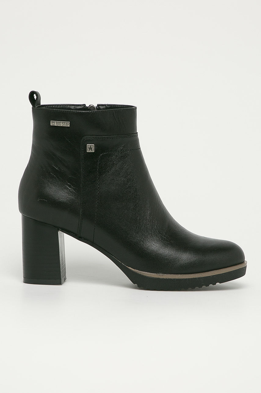 Botki z kolekcji Big Star. Model wykonany ze skóry naturalnej. – Zapięcie na suwak. – Usztywniony nosek. – Gumowa podeszwa. – Tekstylne wnętrze. – Model na obcasie typu słupek. – Usztywniony zapiętek. – Wysokość obcasa: 6,5 cm. – Długość wkładki wynosi: 23,5 cm. – Wymiary podane dla rozmiaru: 37. Obcas: słupek Ocieplenie: nieocieplane Materiał: skóra licowa Wysokość obcasa: 5-8 cm Zapięcie: na zamek Skład: Cholewka: Skóra naturalna, Wnętrze: Materiał tekstylny, Podeszwa: Materiał syntetyczny ID produktu: 4900-OBD2H6 Kod producenta: GG274890