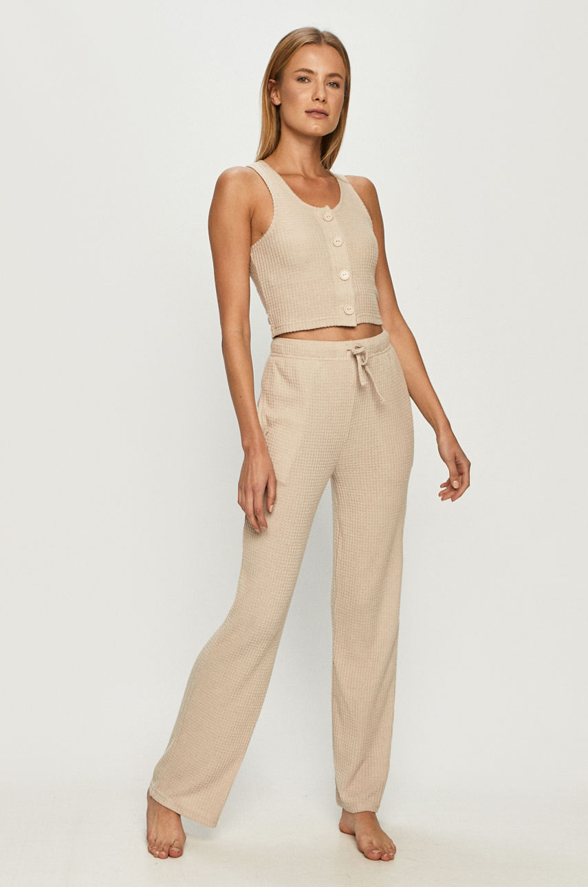 Piżama z kolekcji Brave Soul. Model wykonany z gładkiej dzianiny. – Dopasowana góra i luźny dół. – Okrągły dekolt. – Zapięcie na guziki. – Cienka, elastyczna dzianina. – Elastyczna listwa w pasie. – Szerokość w pasie: 35 cm. – Wysokość stanu: 30 cm. – Długość nogawki: 75 cm. – Szerokość pod pachami: 36 cm. – Długość: 42 cm. – Wymiary podane dla rozmiaru: S. Wzór: gładkie Rodzaj: komplet Materiał: dzianina Skład: 4 % Elastan, 62 % Poliester, 34 % Wiskoza ID produktu: 4900-BID0IG Kod producenta: LPJ.533WAFFLESNAT