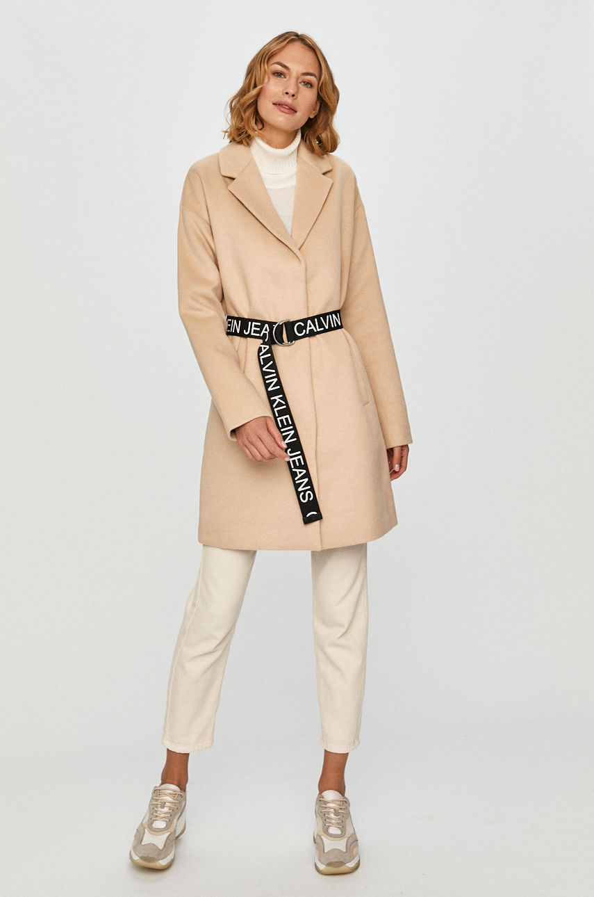 Płaszcz z kolekcji Calvin Klein Jeans. Lekko ocieplony model wykonany z gładkiego materiału. – Obniżona linia ramion. – Prosty fason. – Wsuwane kieszenie. – W talii pasek. – Zapięcie na zatrzaski. – Model na podszewce. – Długość rękawa: 56 cm. – Długość: 90 cm. – Szerokość pod pachami: 50 cm. – Wymiary podane dla rozmiaru: S. Podszewka: z podszewką Kaptur: bez kaptura Ocieplenie: lekko ocieplane Materiał: z domieszką wełny Skład: Podszewka: 100 % Poliester, Materiał zasadniczy: 73 % Poliester, 27 % Wełna ID produktu: 4900-KPD010 Kod producenta: J20J214841