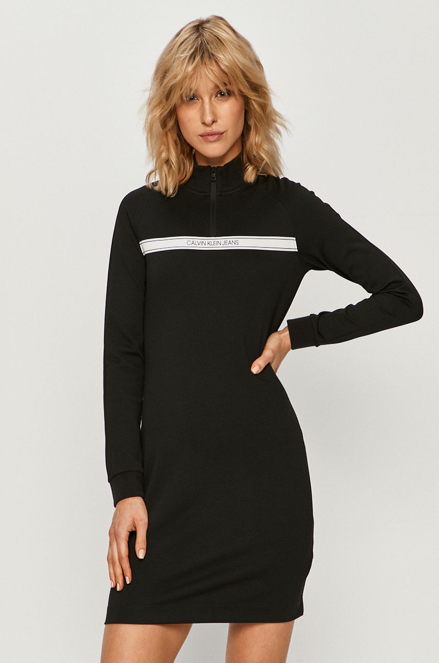 Sukienka z kolekcji Calvin Klein Jeans. Dopasowany model wykonany z grubej, lekko elastycznej dzianiny. – Dopasowany fason. – Raglanowy rękaw. – Krótkie zapięcie na suwak. – Model z aplikacją. – Szerokość pod pachami: 42 cm. – Długość rękawa(mierzona od kołnierzyka): 68 cm. – Długość: 86 cm. – Wymiary podane dla rozmiaru: S. Wzór: aplikacja Materiał: dzianina Fason: dopasowany Długość: mini Rękaw: długi Dekolt: zapinany Materiał: z elastanem Okazje: casual Skład: Materiał zasadniczy: 4 % Elastan, 77 % Poliester, 19 % Wiskoza, Aplikacja: 100 % Poliester, Ściągacz: 77 % Bawełna, 3 % Elastan, 20 % Poliester ID produktu: 4900-SUD015 Kod producenta: J20J214153