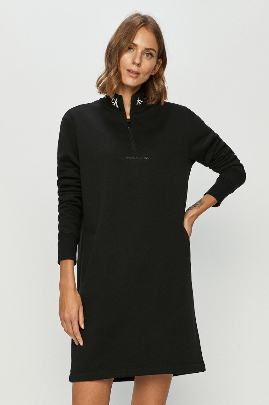 Sukienka z kolekcji Calvin Klein Jeans. Luźny model wykonany z gładkiej dzianiny. – Luźny fason. – Długi rękaw. – Wsuwane kieszenie. – Krótkie zapięcie na suwak. – Gruba, nieelastyczna dzianina. – Szerokość pod pachami: 53 cm. – Długość rękawa: 65 cm. – Długość: 88 cm. – Wymiary podane dla rozmiaru: S. Wzór: gładkie Materiał: dzianina Długość: mini Rękaw: długi Okazje: casual Fason: oversize Dekolt: półgolf Skład: 63 % Bawełna, 37 % Poliester ID produktu: 4900-SUD06M Kod producenta: J20J214924