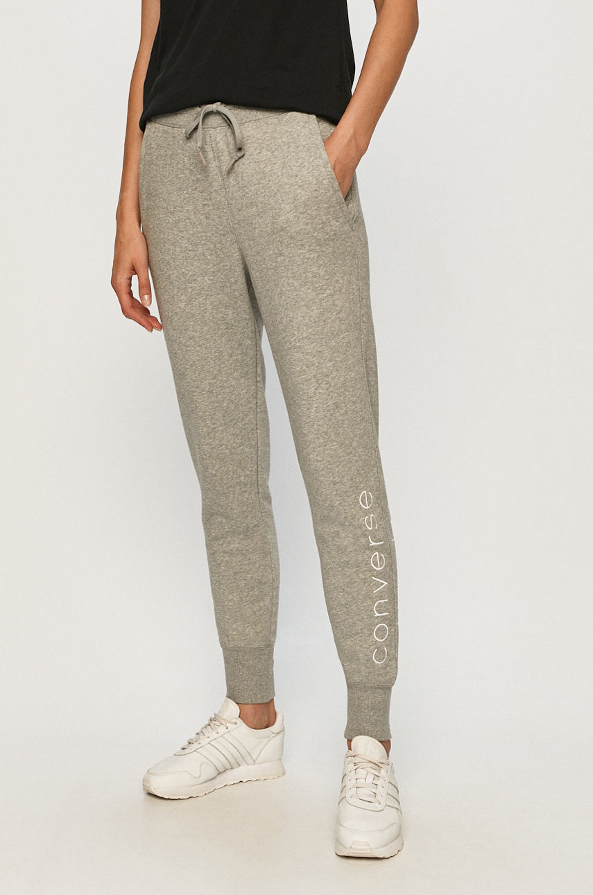 Spodnie z kolekcji Converse. Model wykonany z gładkiej dzianiny. – Elastyczna listwa w pasie. – W pasie troczki. – Nogawki wykończone ściągaczem. – Wsuwane kieszenie. – Miękko wyściełany model. – Szerokość w pasie: 34 cm. – Szerokość w biodrach: 50 cm. – Wysokość stanu: 30 cm. – Szerokość nogawki na dole: 11 cm. – Długość: 101 cm. – Szerokość nogawki: 28 cm. – Wymiary podane dla rozmiaru: S. Wzór: aplikacja Materiał: dzianina Skład: Materiał zasadniczy: 80 % Bawełna, 20 % Poliester, Ściągacz: 96 % Bawełna, 4 % Elastan ID produktu: 4900-SPD0FB Kod producenta: 10019803.A02