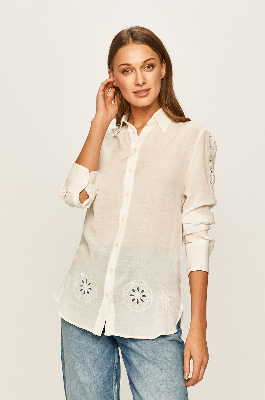 Koszula z kolekcji Desigual. Model wykonany z gładkiej tkaniny. – Prosty fason. – Zapięcie na guziki. – Rękawy z zapinanymi mankietami. – Długość rękawa: 60 cm. – Szerokość pod pachami: 49 cm. – Długość: 67 cm. – Wymiary podane dla rozmiaru: S. Wzór: gładkie Fason: regular Rękaw: długi Kołnierzyk: klasyczny Okazje: casual Skład: Materiał zasadniczy: 30 % Poliester, 70 % Wiskoza, Aplikacja: 68 % Poliester, 32 % Włókno metaliczne, Wskazówki pielęgnacyjne: nie prać chemicznie, prać w pralce w temperaturze 30 stopni, suszyć w stanie rozłożonym, nie wybielać, prasować w niskiej temperaturze ID produktu: 4901-KDD01F Kod producenta: 20SWCW28