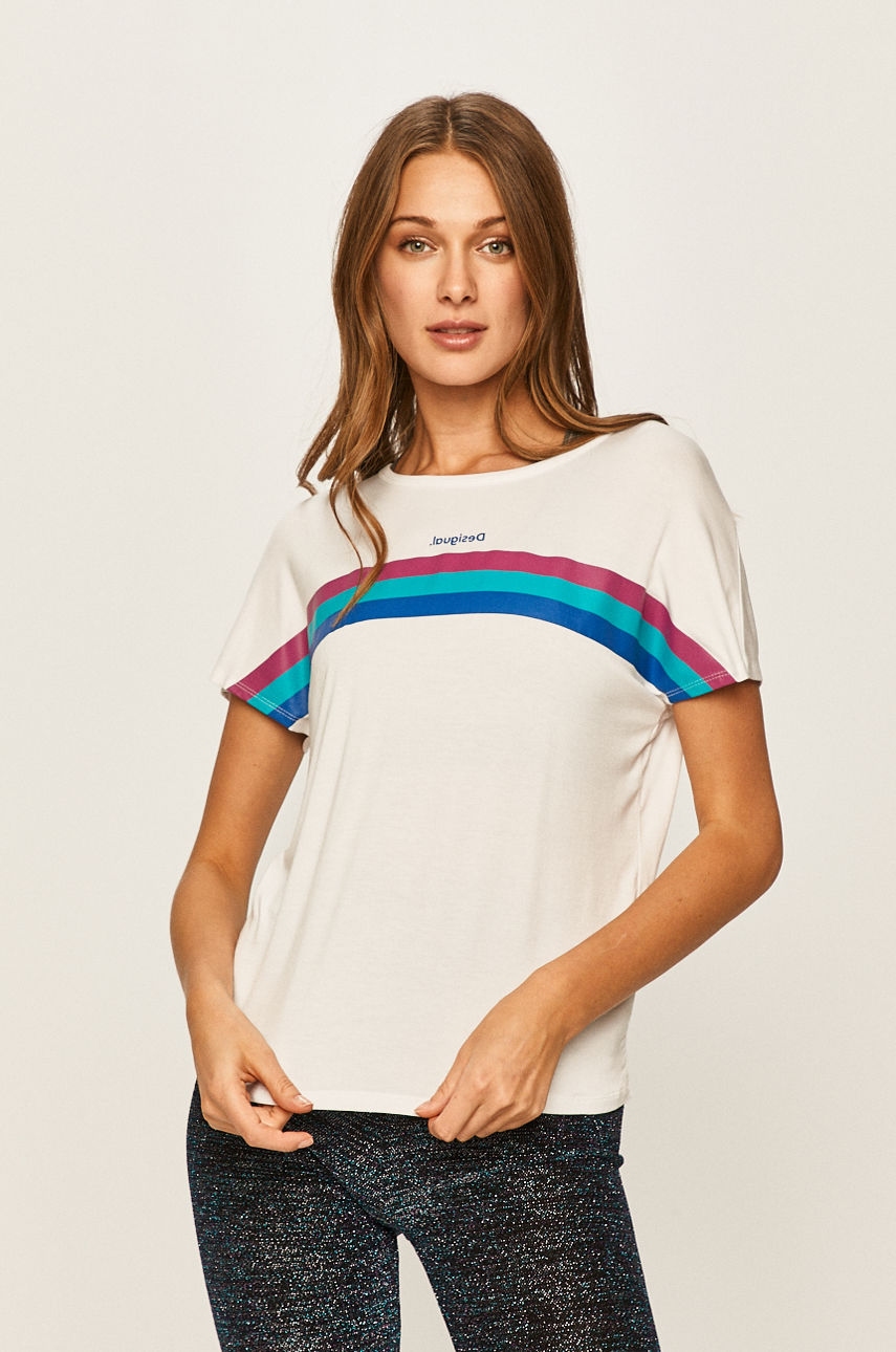 T-shirt z kolekcji Desigual Sport. Model wykonany z dzianiny z nadrukiem. – Okrągły dekolt. – Elastyczny materiał. – Model z nadrukiem. – Ozdobne zakładki. – Długość: 58 cm. – Szerokość pod pachami: 47 cm. – Wymiary podane dla rozmiaru: S. Wzór: nadruk Dekolt: okrągły Materiał: z elastanem Okazje: sport Skład: 5 % Elastan, 95 % Wiskoza ID produktu: 4901-TSD152 Kod producenta: 20SOTK02