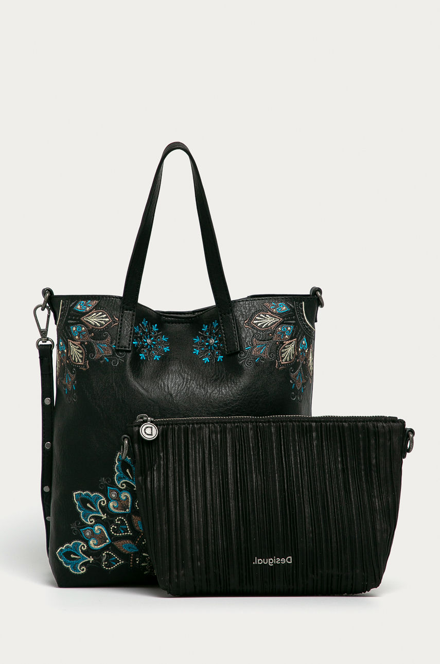 Średniej wielkości torebka z kolekcji Desigual. zapinany wykonany ze skóry ekologicznej. – Model dwa w jednym – posiada odpinaną komorę, którą można nosić jako osobny model. – Zapięcie na magnes. – Dopinany dłuższy pasek z regulacją. – Torebka do noszenia w ręku lub na ramieniu. – Krótkie uchwyty. – Nie mieści formatu A4. – Głębokość: 7 cm. – Wysokość: 29 cm. – Szerokość u podstawy: 25 cm. – Długość uchwytów: 37 cm. Wzór: aplikacja Wielkość: nie mieści A4 Materiał: imitacja skóry licowej Pasek: odpinany pasek Skład: Podszewka: 100 % Poliester, Materiał zasadniczy: 100 % Poliuretan, Wskazówki pielęgnacyjne: nie prać chemicznie, nie suszyć w suszarce bębnowej, nie wybielać, nie prasować, Nie prać ID produktu: 4900-TOD039 Kod producenta: 20WAXPB0