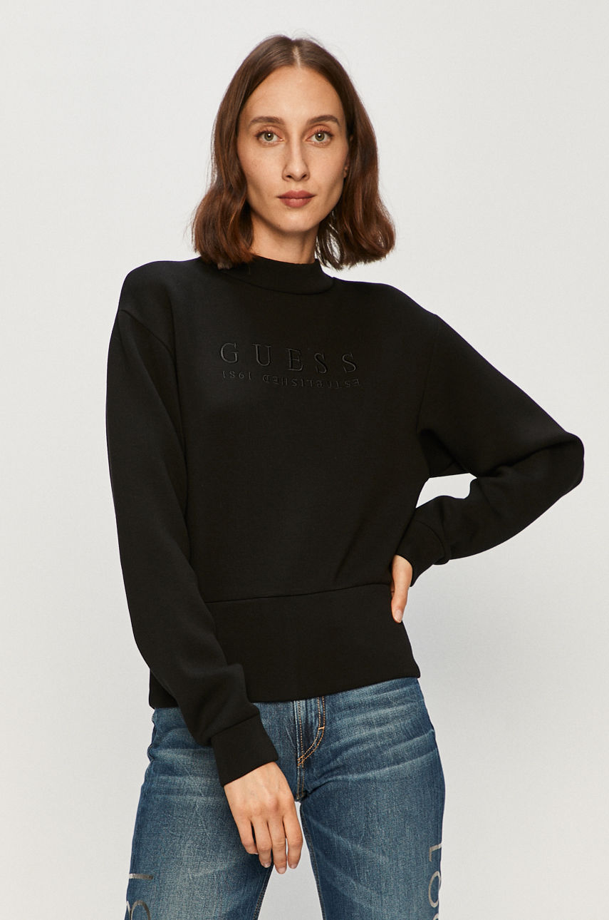 Bluza z kolekcji Guess Jeans. Model wykonany z grubej, elastycznej dzianiny. – Prosty fason. – Podwyższony kołnierz. – Krótkie zapięcie na suwak. – Gruba, elastyczna dzianina. – Model z ozdobną aplikacją. – Długość rękawa: 62 cm. – Długość: 60 cm. – Szerokość pod pachami: 48 cm. – Wymiary podane dla rozmiaru: S. Wzór: aplikacja Materiał: z elastanem Kaptur: bez kaptura Skład: Materiał zasadniczy: 15 % Nylon, 77 % Rayon, 8 % Spandex ID produktu: 4900-BLD01R Kod producenta: W0YQ40.K7UW0