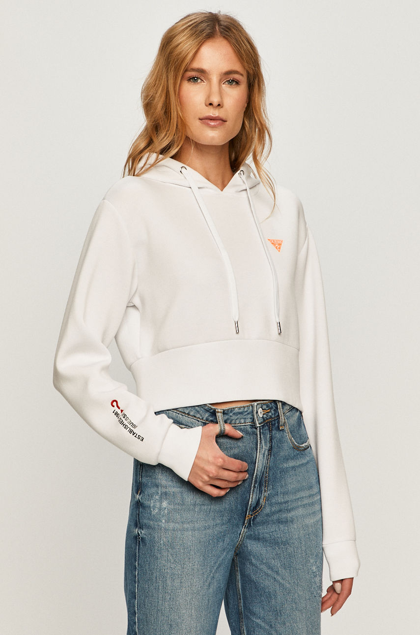 Bluza z kapturem z kolekcji Guess Jeans. Model wykonany z cienkiej, elastycznej dzianiny. – Prosty fason. – Długi rękaw. – Kaptur ściągany troczkami. – Miękko wyściełany model. – Wykończenie ze ściągacza. – Naszywka z logo marki. – Długość rękawa: 61 cm. – Długość: 45 cm. – Szerokość pod pachami: 50 cm. – Wymiary podane dla rozmiaru: S. Wzór: gładkie Materiał: z elastanem Kaptur: z kapturem Skład: Materiał zasadniczy: 8 % Elastan, 15 % Poliamid, 77 % Wiskoza, Podszewka kaptura: 100 % Bawełna ID produktu: 4900-BLD01T Kod producenta: W0BQ09.K7UW2