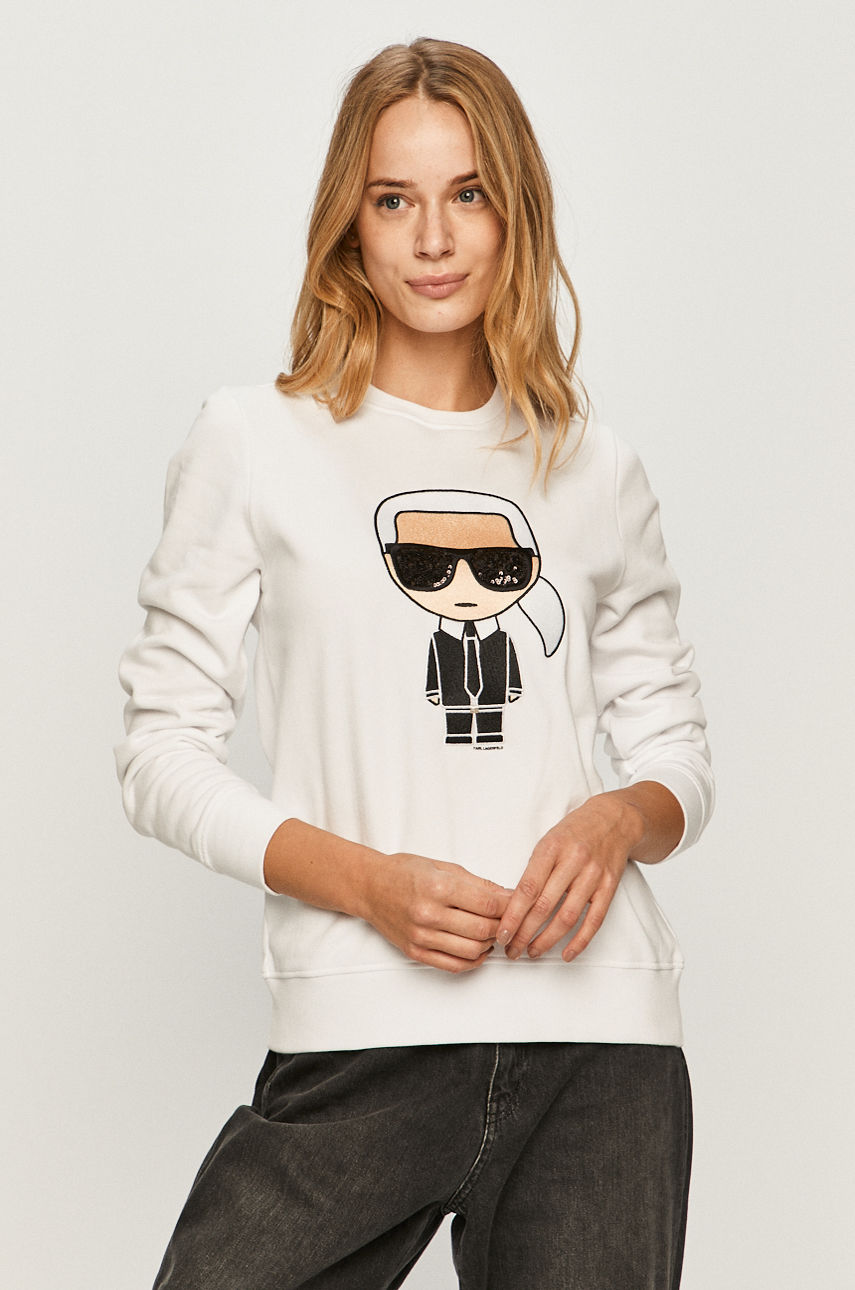 Bluza z kolekcji Karl Lagerfeld. Model wykonany z cienkiej, lekko elastycznej dzianiny. – Prosty fason. – Miękko wyściełany model. – Okrągły dekolt. – Cienka, elastyczna dzianina. – Model z aplikacją. – Wykończenie ze ściągacza. – Długość rękawa: 61 cm. – Długość: 61 cm. – Szerokość pod pachami: 49 cm. – Wymiary podane dla rozmiaru: S. Wzór: aplikacja Materiał: bawełna Kaptur: bez kaptura Skład: 100 % Bawełna ID produktu: 4900-BLD09G Kod producenta: 205W1801
