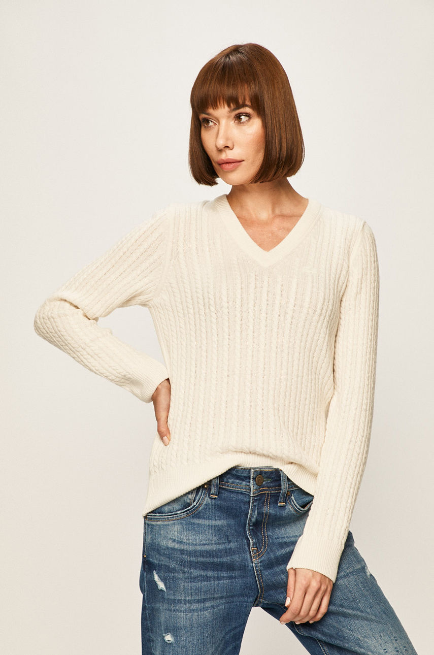 Sweter z kolekcji Lacoste. Model ze spiczastym dekoltem, wykonany z cienkiej dzianiny. – Spiczasty dekolt. – Wykończenie ze ściągacza. – Gładka dzianina. – Długość rękawa: 64 cm. – Długość: 60 cm. – Szerokość pod pachami: 45 cm. – Wymiary podane dla rozmiaru: 36. Wzór: gładkie Dekolt: szpic Materiał: z domieszką wełny Dzianina: cienka Skład: 5 % Kaszmir, 25 % Poliamid, 25 % Wełna, 45 % Wiskoza ID produktu: 4910-SWD0FE Kod producenta: AF8738