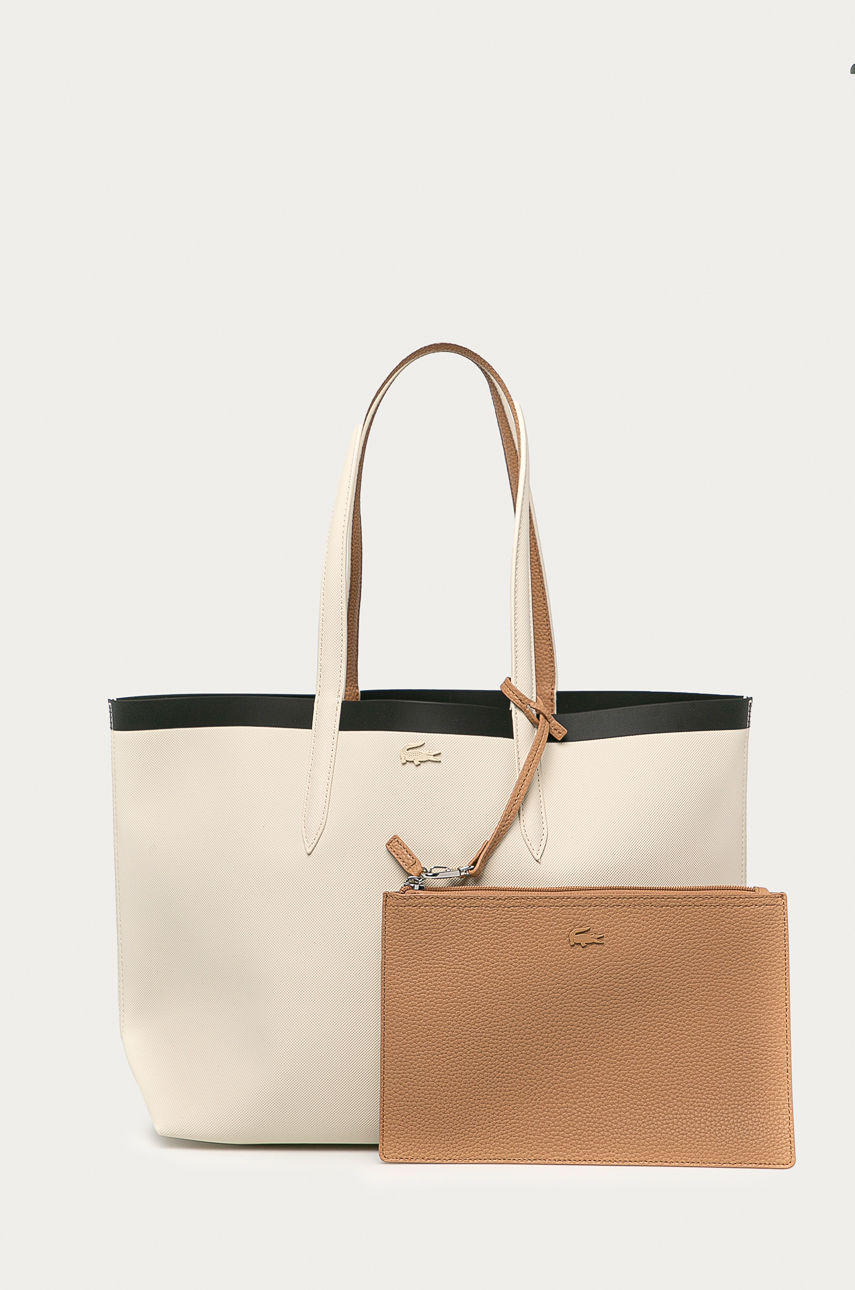 Duża torebka typu shopper z kolekcji Lacoste. zapinany wykonany ze skóry ekologicznej. – Model dwustronny. – Niezapinana komora. – Torebka do noszenia na ramieniu. – Długie uchwyty. – Mieści format A4. – Długość uchwytów: 55 cm. – Głębokość: 14 cm. – Wysokość: 30 cm. – Szerokość u podstawy: 34 cm. Wzór: gładkie Wielkość: mieści A4 Materiał: imitacja skóry licowej Pasek: bez paska Skład: 100 % PVC ID produktu: 4901-TOD12P Kod producenta: NF2994AS