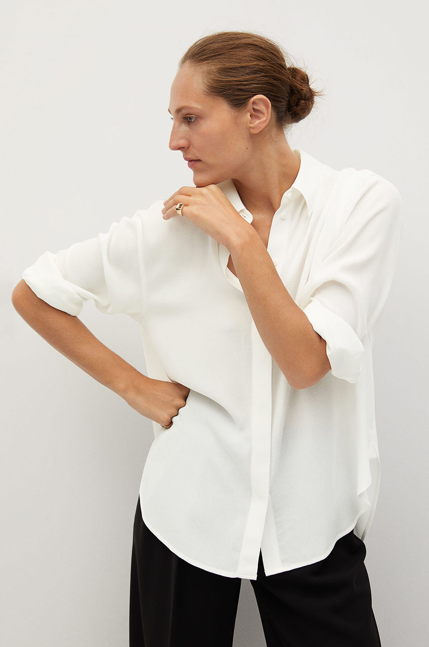 Koszula z kolekcji Mango. Model wykonany z gładkiej tkaniny. – Luźny fason. – Model z kołnierzykiem. – Długi rękaw. – Rękawy z zapinanymi mankietami. – Zapięcie na guziki. – Dłuższy tył. Wzór: gładkie Rękaw: długi Materiał: wiskoza Kołnierzyk: klasyczny Okazje: casual Fason: relaxed Skład: 100 % Wiskoza ID produktu: -100-KDD00D Kod producenta: 77052508