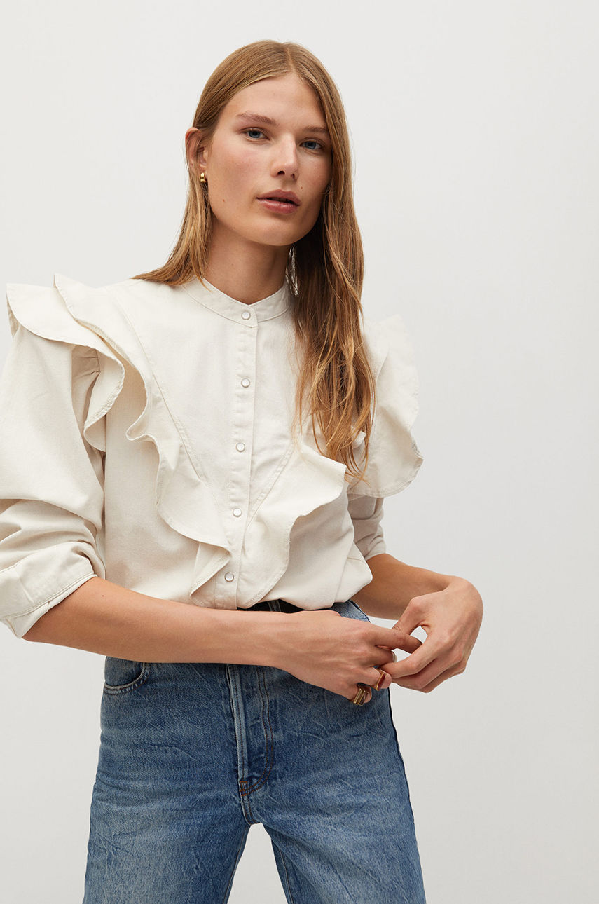 Koszula z kolekcji Mango. Model wykonany z gładkiej tkaniny. – Prosty fason. – Długi rękaw. – Rękawy z zapinanymi mankietami. – Zapięcie na guziki. – Model z ozdobnymi falbanami. – Model ze stójką. Wzór: gładkie Fason: regular Rękaw: długi Materiał: bawełna Okazje: casual Kołnierzyk: stójka Skład: 100 % Bawełna ID produktu: -100-KDD00P Kod producenta: 77047638