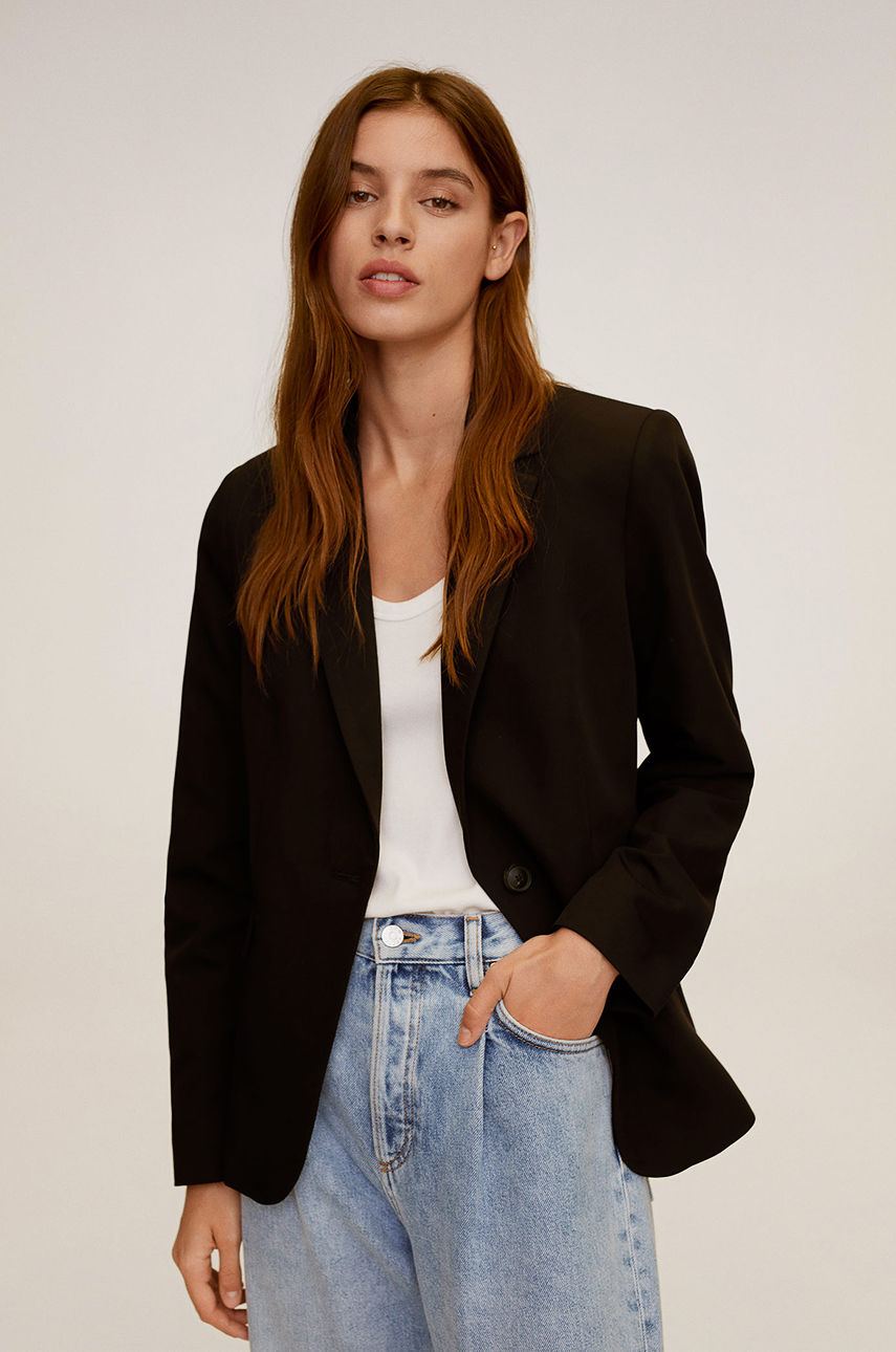 Marynarka z kolekcji Mango. Model wykonany z gładkiej tkaniny. – Prosty fason. – Z przodu kieszonki. – Zapięcie na guzik. – Cienki materiał. – Model na podszewce. – Klasyczne klapy. Wzór: gładkie Materiał: tkanina Podszewka: z podszewką Fason: jednorzędowy Skład: Podszewka: 55 % Poliester, 45 % Wiskoza, Materiał zasadniczy: 64 % Poliester, 34 % Wiskoza, 2 % Elastan, Podszewka rękawów: 100 % Poliester ID produktu: -100-KZD001 Kod producenta: 77040108