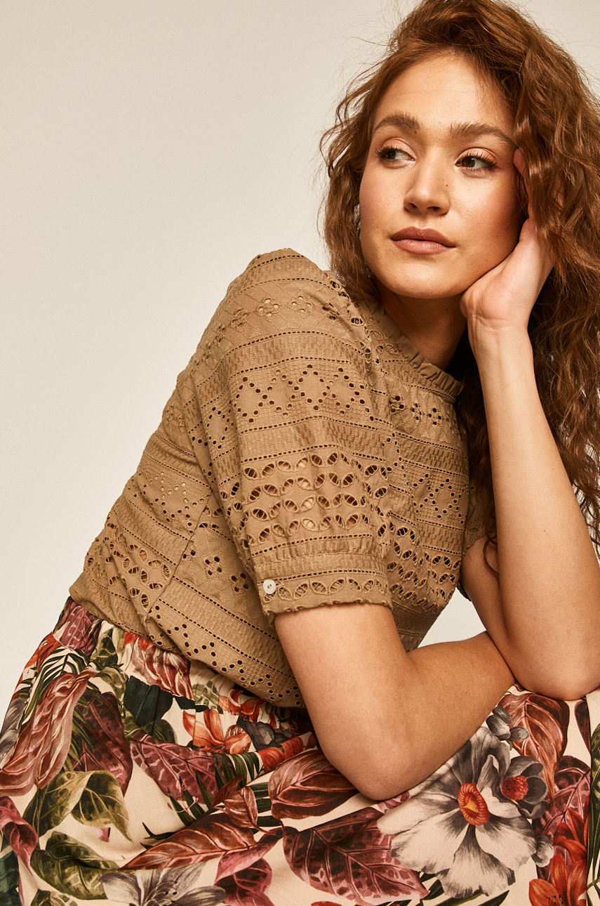 Bluzka z kolekcji Medicine. Model wykonany z ażurowego materiału. Posiada stójkę. – Prosty fason. – Model ze stójką. – Gładka tkanina. Wzór: aplikacja Rękaw: krótki Materiał: bawełna Dekolt: stójka Okazje: casual Fason: relaxed Skład: 100 % Bawełna ID produktu: 6901-BKD702 Kod producenta: RS20.BKD702