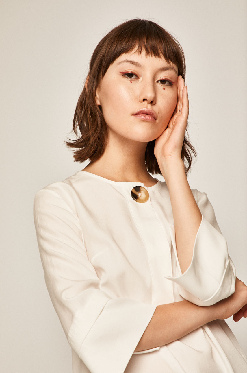 Bluzka z kolekcji Medicine. Model wykonany z gładkiej tkaniny. Posiada okrągły dekolt. – Zapięcie na guziki. – Prosty fason. – Luźny model. – Cienka, nieelastyczna tkanina. – Długość: 41 cm. – Szerokość pod pachami: 47 cm. – Wymiary podane dla rozmiaru: S. Wzór: gładkie Dekolt: okrągły Rękaw: trzy czwarte Dekolt: zapinany Skład: 100 % Lyocell ID produktu: 6910-BKD171 Kod producenta: RW19.BKD171