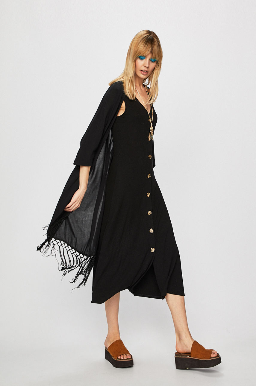 Kimono z kolekcji Medicine. Casualowy model wykonany z gładkiej tkaniny. – Luźny model. – Obniżona linia ramion. – Kimonowe rękawy. – Model z ozdobnymi frędzlami. – Gładka tkanina. – Niezapinany model. – Szerokość pod pachami: 52 cm. – Długość: 85 cm. – Wymiary podane dla rozmiaru: S. Wzór: gładkie Materiał: tkanina Podszewka: bez podszewki Fason: bez zapięcia Fason: kimona Skład: 100 % Wiskoza, ID produktu: 6911-BDD901 Kod producenta: RS19.BDD901