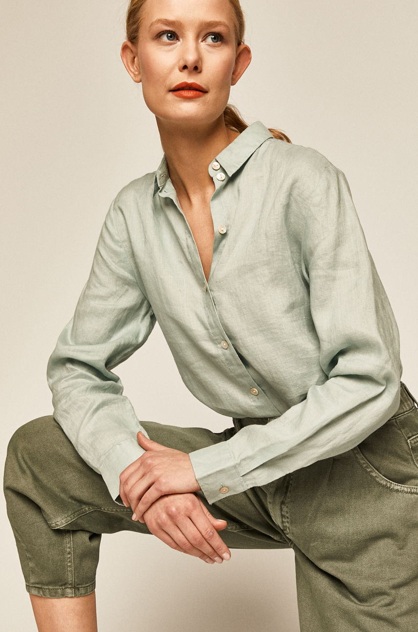 Koszula z kolekcji Medicine. Model wykonany z gładkiej tkaniny. – Luźny fason. – Zapięcie na guziki. – Gładka tkanina. – Szerokość pod pachami: 52,5 cm. – Długość rękawa(mierzona od kołnierzyka): 72 cm. – Długość: 69 cm. – Wymiary podane dla rozmiaru: S. Wzór: gładkie Rękaw: długi Materiał: len Kołnierzyk: klasyczny Okazje: casual Fason: relaxed Skład: 100 % Len ID produktu: 6901-KDD500 Kod producenta: RS20.KDD500