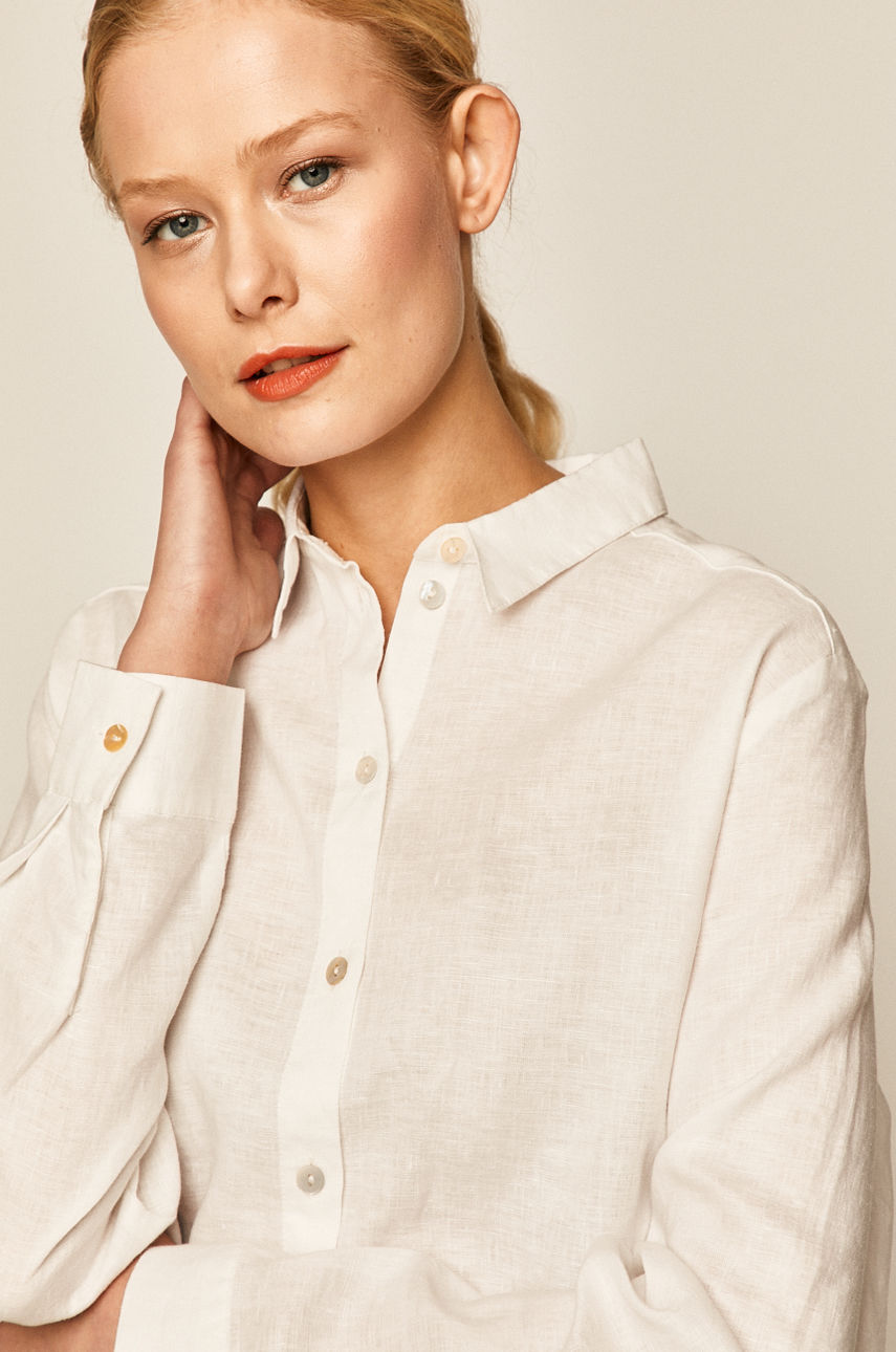 Koszula z kolekcji Medicine. Model wykonany z gładkiej tkaniny. – Luźny fason. – Zapięcie na guziki. – Gładka tkanina. – Szerokość pod pachami: 52,5 cm. – Długość rękawa(mierzona od kołnierzyka): 72 cm. – Długość: 69 cm. – Wymiary podane dla rozmiaru: S. Wzór: gładkie Rękaw: długi Materiał: len Kołnierzyk: klasyczny Okazje: casual Fason: relaxed Skład: 100 % Len ID produktu: 6901-KDD500 Kod producenta: RS20.KDD500