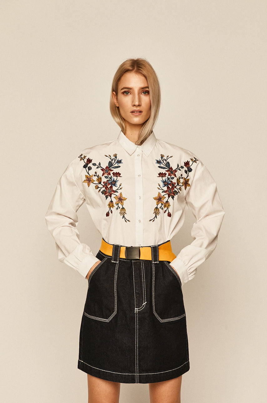 Koszula z kolekcji Medicine. Model wykonany z tkaniny z aplikacją. – Model z ozdobnymi haftami. – Luźny fason. – Obniżona linia ramion. – Zapięcie na guziki. – Szerokość pod pachami: 56 cm. – Długość rękawa(mierzona od kołnierzyka): 77 cm. – Długość: 70 cm. – Wymiary podane dla rozmiaru: S. Wzór: aplikacja Rękaw: długi Materiał: bawełna Kołnierzyk: klasyczny Okazje: casual Fason: relaxed Skład: 100 % Bawełna ID produktu: 6901-KDD204 Kod producenta: RS20.KDD204