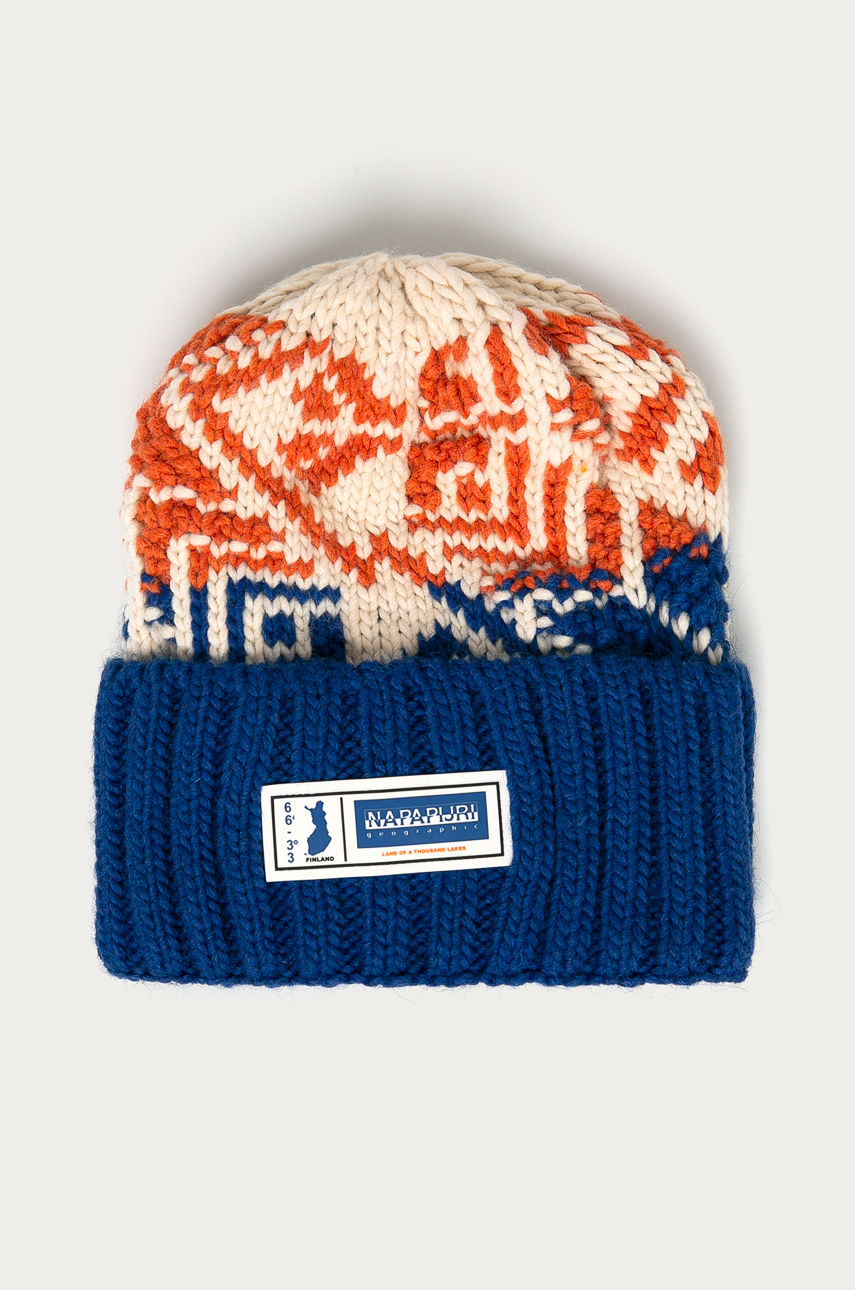 Czapka z kolekcji Napapijri. Model wykonany z wzorzystej dzianiny. Wzór: wzorzyste Materiał: z domieszką wełny Dzianina: gruba Skład: 75 % Akryl, 10 % Poliamid, 10 % Wełna, 5 % Wiskoza ID produktu: 4900-CAU00P Kod producenta: NP0A4EOS