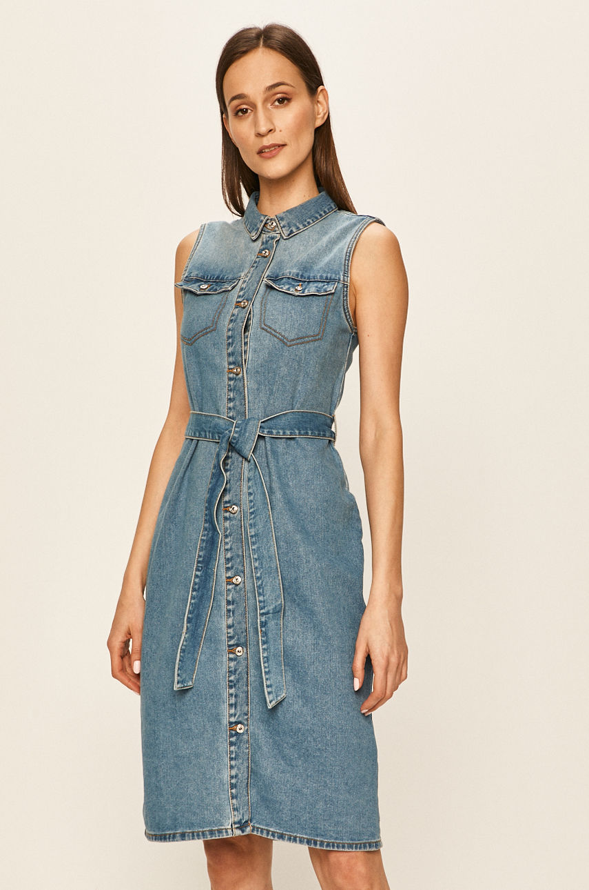 Sukienka z kolekcji Noisy May. Prosty model wykonany z denimu. – Model z wiązaniem. – Zapięcie na guziki. – Model z kołnierzykiem. – Kieszonki na piersi. – Prosty fason. Wzór: gładkie Materiał: tkanina Rękaw: na ramiączkach Długość: midi Materiał: jeans Dekolt: zapinany Materiał: bawełna Okazje: casual Fason: prosty Skład: 100 % Bawełna ID produktu: 4901-SUD177 Kod producenta: 27011448