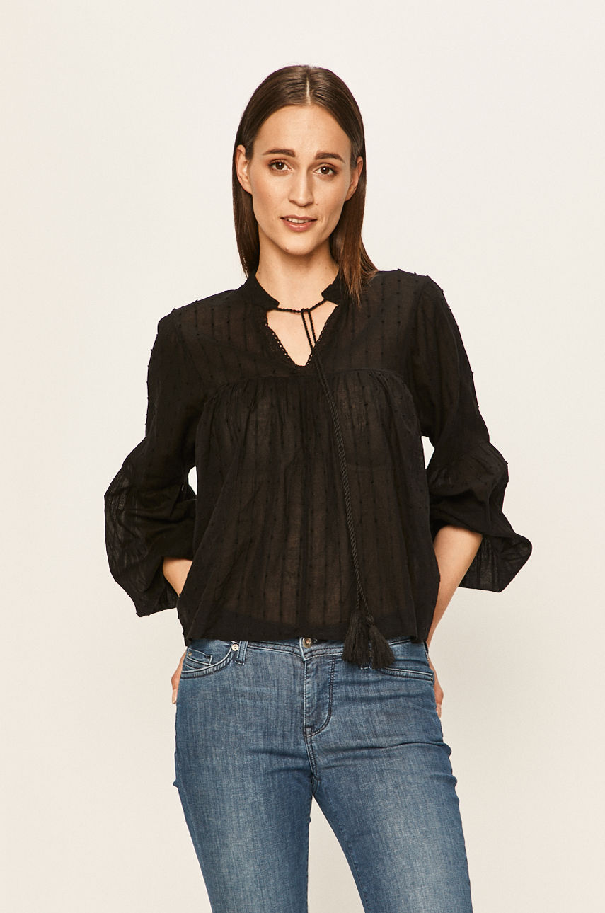 Bluzka z kolekcji Only. Model wykonany z gładkiej tkaniny. Posiada wiązany dekolt. – Model z wiązaniem. – Model z ozdobną falbaną. – Spiczasty dekolt. – Luźny model. – Rękawy wykończone ściągaczem. – Cienka, nieelastyczna tkanina. – Długość rękawa: 55 cm. – Długość: 61 cm. – Szerokość pod pachami: 50 cm. – Wymiary podane dla rozmiaru: 36. Wzór: gładkie Dekolt: szpic Rękaw: długi Materiał: bawełna Fason: relaxed Skład: 100 % Bawełna ID produktu: 4901-BDD007 Kod producenta: 15195851