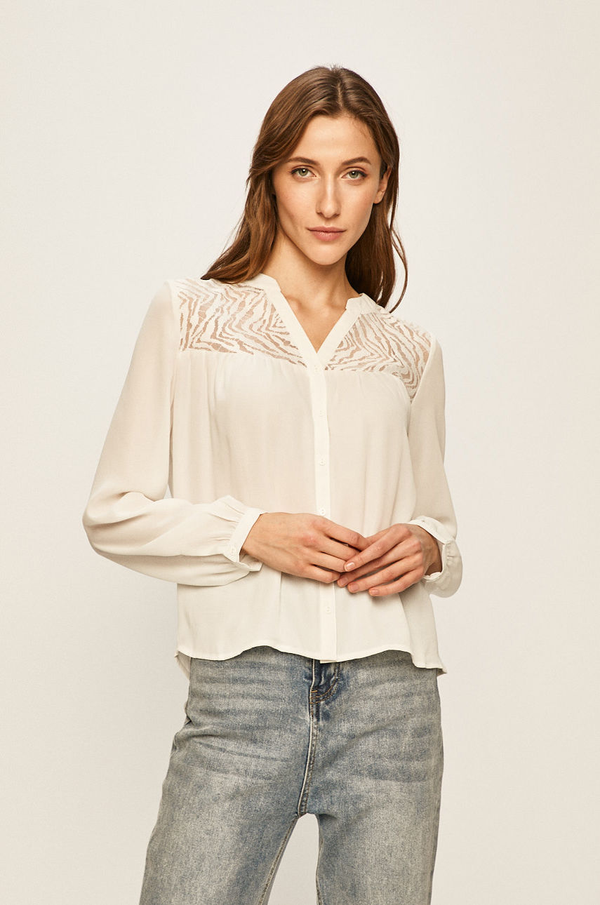 Bluzka z kolekcji Only. Model wykonany z gładkiej tkaniny. Posiada spiczasty dekolt. – Luźny fason. – Spiczasty dekolt. – Zapięcie na guziki. – Cienka, nieelastyczna tkanina. – Koronkowe wstawki. – Szerokość pod pachami: 56,5 cm. – Długość rękawa: 61 cm. – Długość: 55 cm. – Wymiary podane dla rozmiaru: 36. Wzór: gładkie Dekolt: szpic Rękaw: długi Skład: Materiał zasadniczy: 62 % Poliester z recyklingu, 38 % Poliester, Wstawki: 10 % Elastan, 90 % Poliester ID produktu: 4901-BUD003 Kod producenta: 15191347