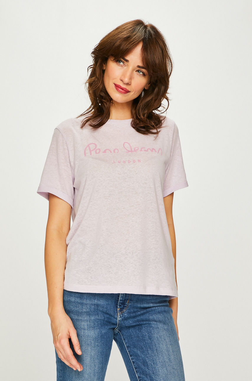 Top z kolekcji Pepe Jeans. Model wykonany z dzianiny z nadrukiem. – Prosty fason. – Okrągły dekolt. – Cienka, elastyczna dzianina. – Model z nadrukiem. – Długość: 57 cm. – Szerokość pod pachami: 49 cm. – Wymiary podane dla rozmiaru: S. Wzór: nadruk Dekolt: okrągły Materiał: z domieszką lnu Okazje: casual Skład: Materiał zasadniczy: 40 % Bawełna, 30 % Len, 30 % Poliester, ID produktu: 4911-TSD0F9 Kod producenta: PL503975