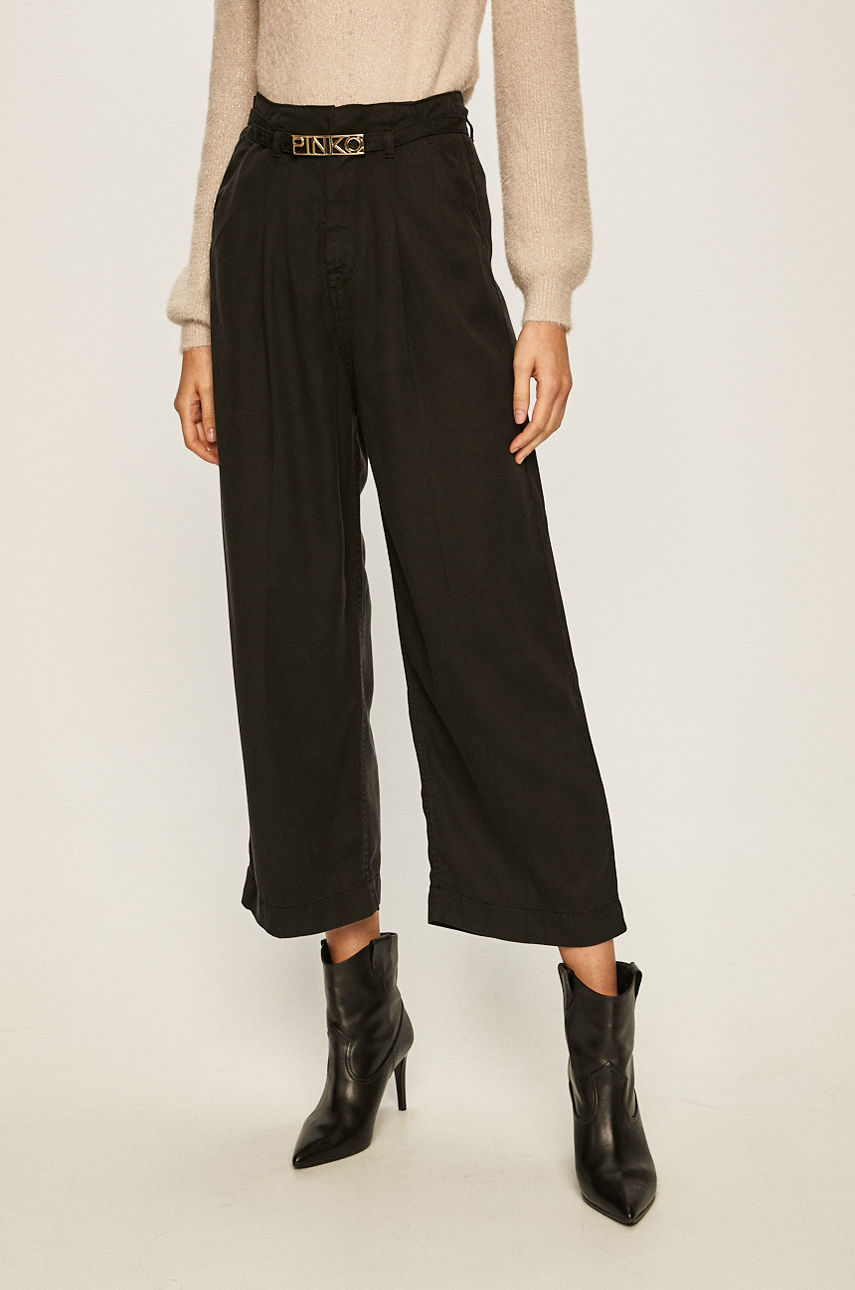 Spodnie z kolekcji Pinko. Model wykonany z gładkiego materiału. Uwaga: oryginalna rozmiarówka produktów tej marki jest rozmiarówką włoską. Informujemy, że rozmiary na metkach mogą różnić się od zamawianych ze względu na zastosowany przelicznik. – Rozszerzana nogawka. – Nogawka zaprasowana w kantkę. – Wsuwane kieszenie. – Zapięcie na suwak i haftkę. – Dołączony pasek. – Szerokość w pasie: 32 cm. – Szerokość w biodrach: 38 cm. – Wysokość stanu: 36 cm. – Szerokość nogawki na dole: 27 cm. – Szerokość nogawki: 30 cm. – Długość: 97 cm. – Wymiary podane dla rozmiaru: 27. Wzór: gładkie Materiał: tkanina Talia: high Fason: culottes Skład: 100 % Lyocell ID produktu: 4910-SPD01D Kod producenta: 1J10B9.Y5PY