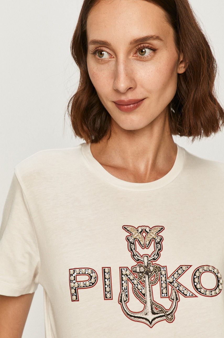 Lekki T-shirt z kolekcji Pinko. Model wykonany z cienkiej, elastycznej dzianiny. Uwaga: oryginalna rozmiarówka produktów tej marki jest rozmiarówką włoską. Informujemy, że rozmiary na metkach mogą różnić się od zamawianych ze względu na zastosowany przelicznik. – Prosty fason. – Okrągły dekolt. – Cienka, elastyczna dzianina. – Model z aplikacją. – Długość: 65 cm. – Szerokość pod pachami: 46 cm. – Wymiary podane dla rozmiaru: S. Wzór: aplikacja Dekolt: okrągły Materiał: bawełna Okazje: casual Skład: Materiał zasadniczy: 100 % Bawełna, Wstawki: 100 % Szkło, Wykończenie: 100 % Inny materiał ID produktu: 4900-TSD0JE Kod producenta: 1G15BU.Y6EV