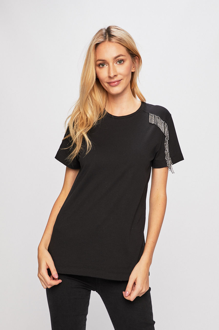 T-shirt z kolekcji Pinko. Model wykonany z gładkiej dzianiny. Uwaga: oryginalna rozmiarówka produktów tej marki jest rozmiarówką włoską. Informujemy, że rozmiary na metkach mogą różnić się od zamawianych ze względu na zastosowany przelicznik. – Prosty fason. – Okrągły dekolt. – Cienka, elastyczna dzianina. – Ozdobny detal z przodu. – Szerokość pod pachami: 48,5 cm. – Długość: 64,5 cm. – Wymiary podane dla rozmiaru: S. Wzór: gładkie Dekolt: okrągły Materiał: bawełna Skład: Materiał zasadniczy: 100 % Bawełna, Materiał 1: 100 % Poliester, Materiał 2: 100 % Szkło, Materiał 3: 100 % Żelazo ID produktu: 4910-TSD029 Kod producenta: 1G14GG.5071