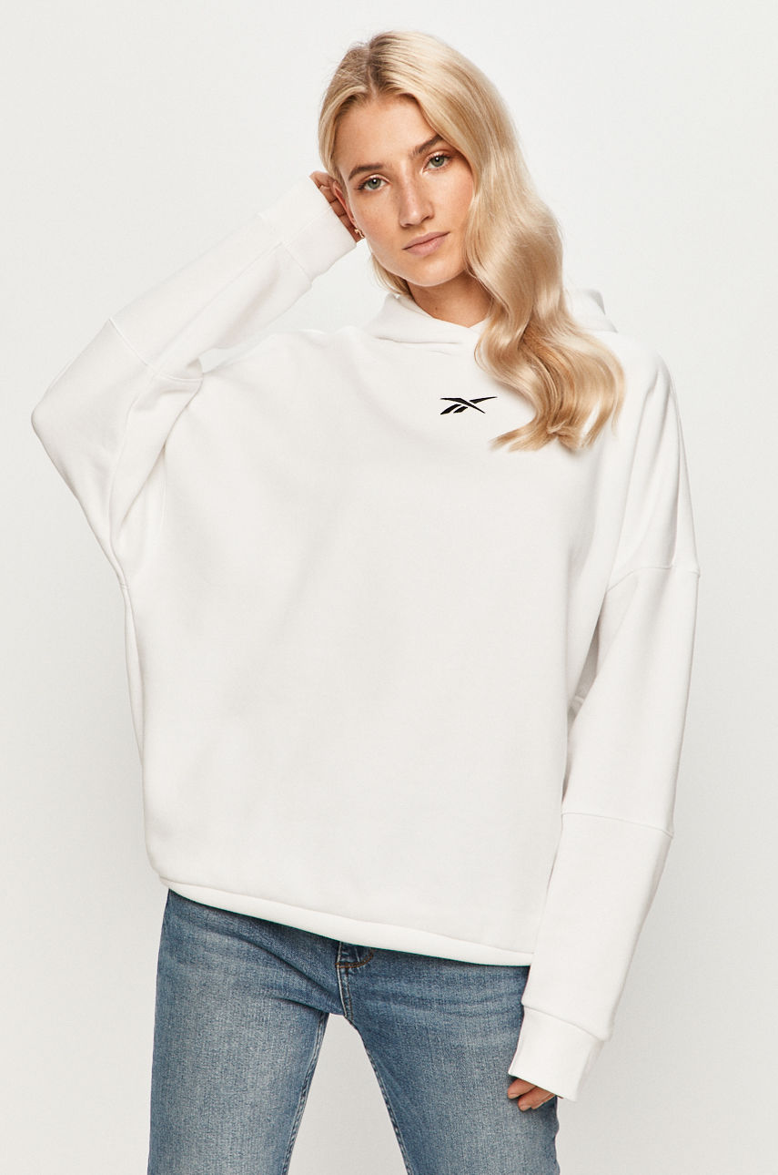Bluza z kapturem z kolekcji Reebok. Model wykonany z grubej, lekko elastycznej dzianiny. – Luźny model. – Obniżona linia ramion. – Wykończenie ze ściągacza. – Miękko wyściełany model. – Długość rękawa(mierzona od kaptura): 76 cm. – Długość: 72,5 cm. – Szerokość pod pachami: 64 cm. – Wymiary podane dla rozmiaru: S. Wzór: gładkie Kaptur: z kapturem Skład: 80 % Bawełna, 20 % Poliester ID produktu: 4900-BLD0FD Kod producenta: FU2520