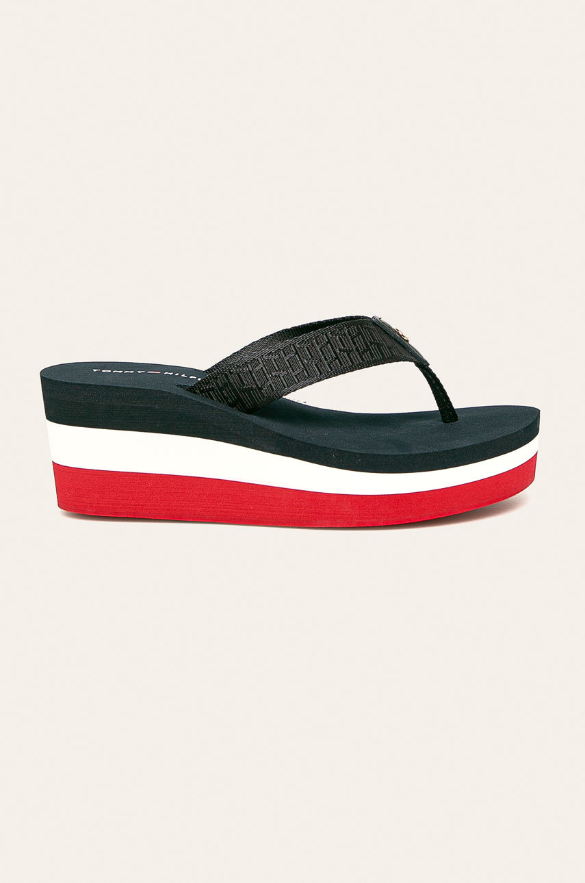 Japonki z kolekcji Tommy Hilfiger. Model wykonany z połączenia skóry naturalnej, materiału tekstylnego i materiału syntetycznego. – Gumowa podeszwa. – Model na koturnie. – Wysokość koturna: 6,5 cm. – Długość wkładki wynosi: 24 cm. – Wymiary podane dla rozmiaru: 37 cm. Materiał: tekstylny Materiał: syntetyczny Obcas: koturn Materiał: skóra licowa Wysokość obcasa: 5-8 cm Skład: Cholewka: Skóra naturalna, Materiał tekstylny, Materiał syntetyczny, Wnętrze: Materiał syntetyczny, Materiał tekstylny, Podeszwa: Materiał syntetyczny ID produktu: 4901-KLD013 Kod producenta: FW0FW04630