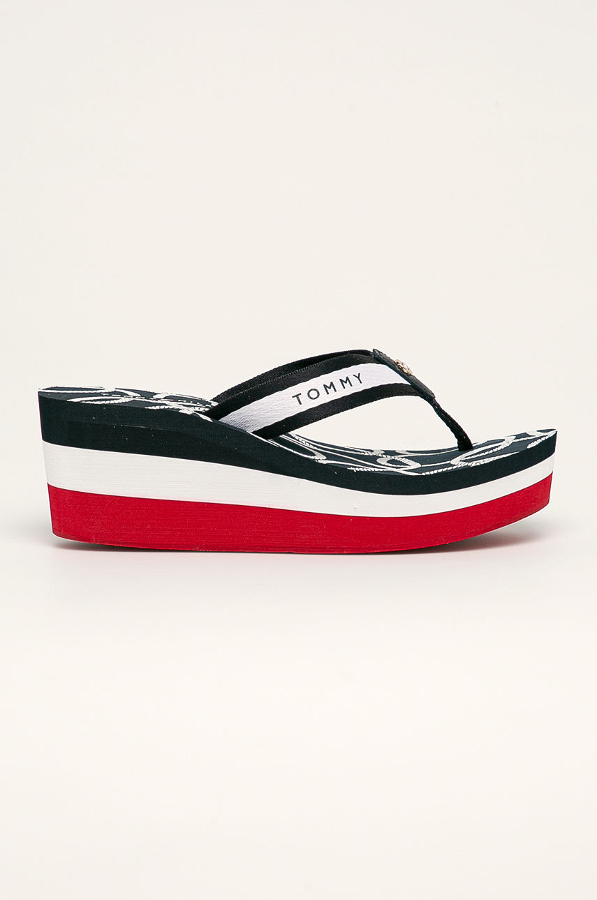 Japonki z kolekcji Tommy Hilfiger. Model wykonany z połączenia skóry naturalnej, materiału tekstylnego i materiału syntetycznego. – Gumowa podeszwa. – Wzorzysty materiał. – Komfortowe wnętrze. – Długość wkładki wynosi: 23,5 cm. – Wymiary podane dla rozmiaru: 37. Materiał: tekstylny Materiał: syntetyczny Obcas: koturn Materiał: skóra licowa Wysokość obcasa: 5-8 cm Skład: Cholewka: Skóra naturalna, Materiał tekstylny, Materiał syntetyczny, Wnętrze: Materiał syntetyczny, Materiał tekstylny, Podeszwa: Materiał syntetyczny ID produktu: 4901-KLD0EB Kod producenta: FW0FW04806