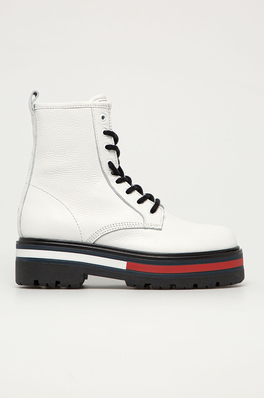 Workery z kolekcji Tommy Jeans. Model wykonany ze skóry naturalnej. – Okrągły, usztywniony nosek. – Usztywniony zapiętek. – Żłobiona podeszwa. – Zapięcie na suwak. – Model na platformie. – Komfortowe wnętrze. – Wysokość platformy: 6 cm. – Długość wkładki wynosi: 23,5 cm. – Wymiary podane dla rozmiaru: 37. Obcas: platforma Ocieplenie: nieocieplane Materiał: skóra licowa Wysokość obcasa: 5-8 cm Fason: workery Zapięcie: na zamek Skład: Cholewka: Skóra naturalna, Wnętrze: Materiał tekstylny, Skóra naturalna, Podeszwa: Materiał syntetyczny ID produktu: 4900-OBD0SA Kod producenta: EN0EN01070YBR