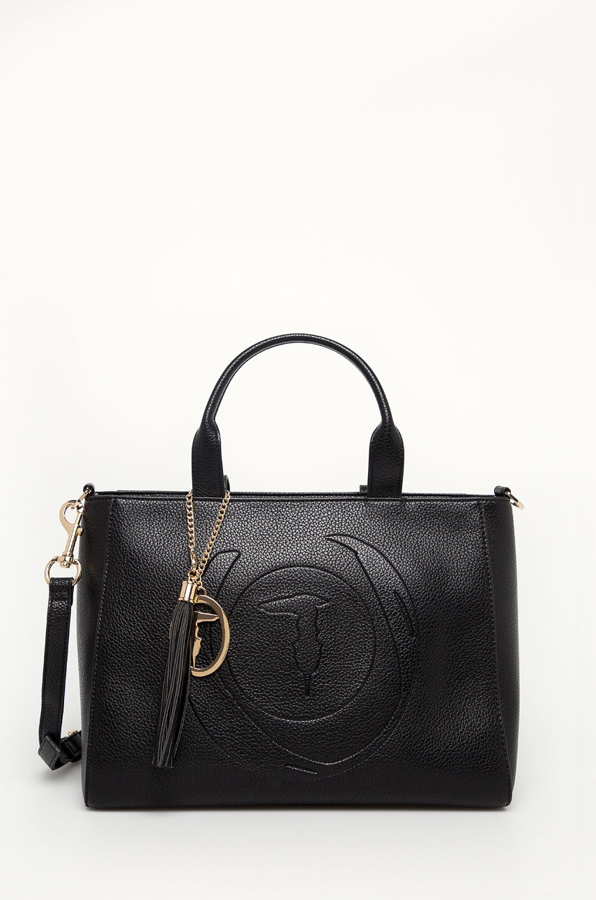 Średniej wielkości torebka z kolekcji Trussardi Jeans. zapinany wykonany ze skóry ekologicznej. Uwaga: oryginalna rozmiarówka produktów tej marki jest rozmiarówką włoską. Informujemy, że rozmiary na metkach mogą różnić się od zamawianych ze względu na zastosowany przelicznik. – Torebka do noszenia w ręku lub na ramieniu. – Krótkie uchwyty. – Nie mieści formatu A4. – Zapięcie na suwak. – Dopinany dłuższy pasek z regulacją. – Głębokość: 14 cm. – Wysokość: 26 cm. – Szerokość u podstawy: 32 cm. – Długość uchwytów: 37 cm. Wzór: gładkie Wielkość: nie mieści A4 Materiał: imitacja skóry licowej Pasek: odpinany pasek Skład: Materiał zasadniczy: 100 % Poliester, Wykończenie: 100 % Poliuretan ID produktu: 4900-TOD145 Kod producenta: 75B01032.9Y099999