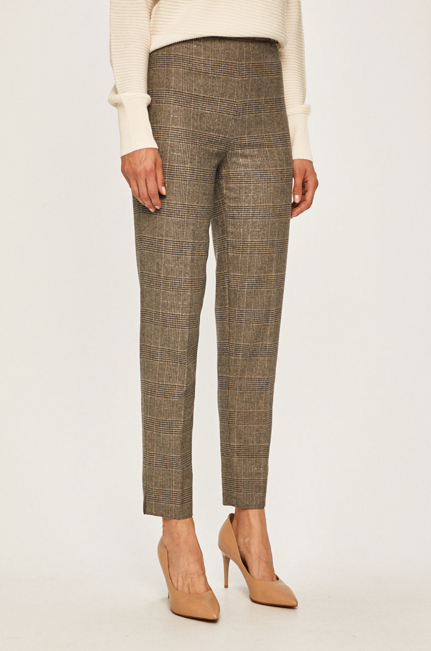 Spodnie z kolekcji Twinset. Model wykonany z wzorzystej tkaniny. – Prosty fason. – Zapięcie na suwak. – Podwyższony stan. – Nogawka zaprasowana w kantkę. – Wzorzysta tkanina. – Szerokość w pasie: 34 cm. – Szerokość w biodrach: 36 cm. – Wysokość stanu: 29 cm. – Szerokość nogawki na dole: 16 cm. – Szerokość nogawki: 27 cm. – Długość nogawki: 99 cm. – Wymiary podane dla rozmiaru: 36. Wzór: gładkie Wzór: wzorzyste Materiał: tkanina Materiał: z elastanem Talia: high Fason: szerokie Skład: 1 % Elastan, 30 % Poliester, 39 % Wełna, 30 % Wiskoza ID produktu: 4910-SPD0C8 Kod producenta: 192TT2440.S11434