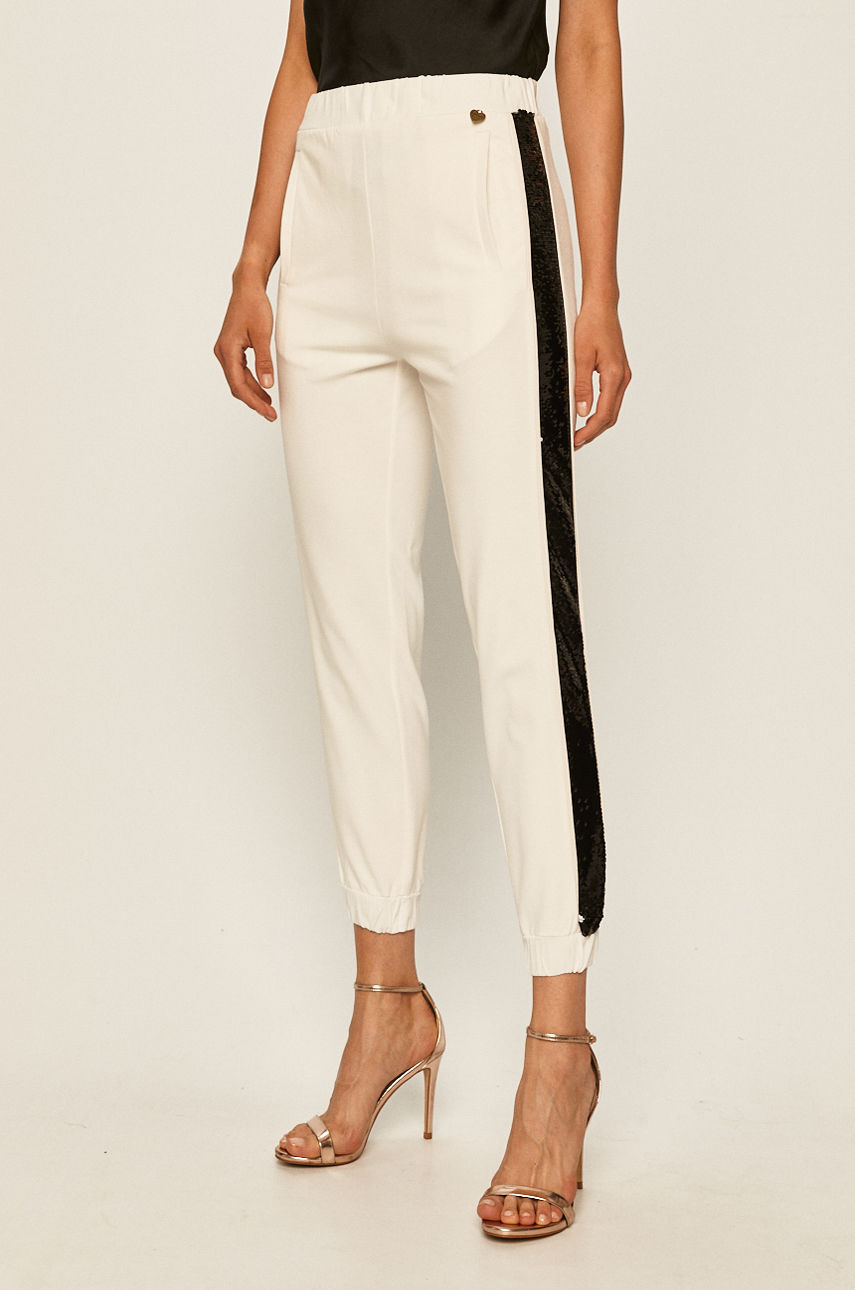 Spodnie z kolekcji Twinset. Model wykonany z cienkiej, lekko elastycznej dzianiny. – Model z cekinowymi wstawkami. – Prosty fason. – Nogawki wykończone ściągaczem. – Wsuwane kieszenie. – Regularna talia. – Elastyczna listwa w pasie. – Szerokość w pasie: 34 cm. – Szerokość w biodrach: 50 cm. – Wysokość stanu: 31 cm. – Szerokość nogawki na dole: 12 cm. – Szerokość nogawki: 27 cm. – Długość: 93 cm. – Wymiary podane dla rozmiaru: 36. Wzór: aplikacja Materiał: dzianina Talia: medium Fason: jogger Skład: Podszewka: 100 % Poliester, Materiał zasadniczy: 5 % Elastan, 27 % Poliamid, 68 % Wiskoza, Wstawki: 5 % Elastan, 95 % Wiskoza ID produktu: 4901-SPD08F Kod producenta: 201TP2292.S11781