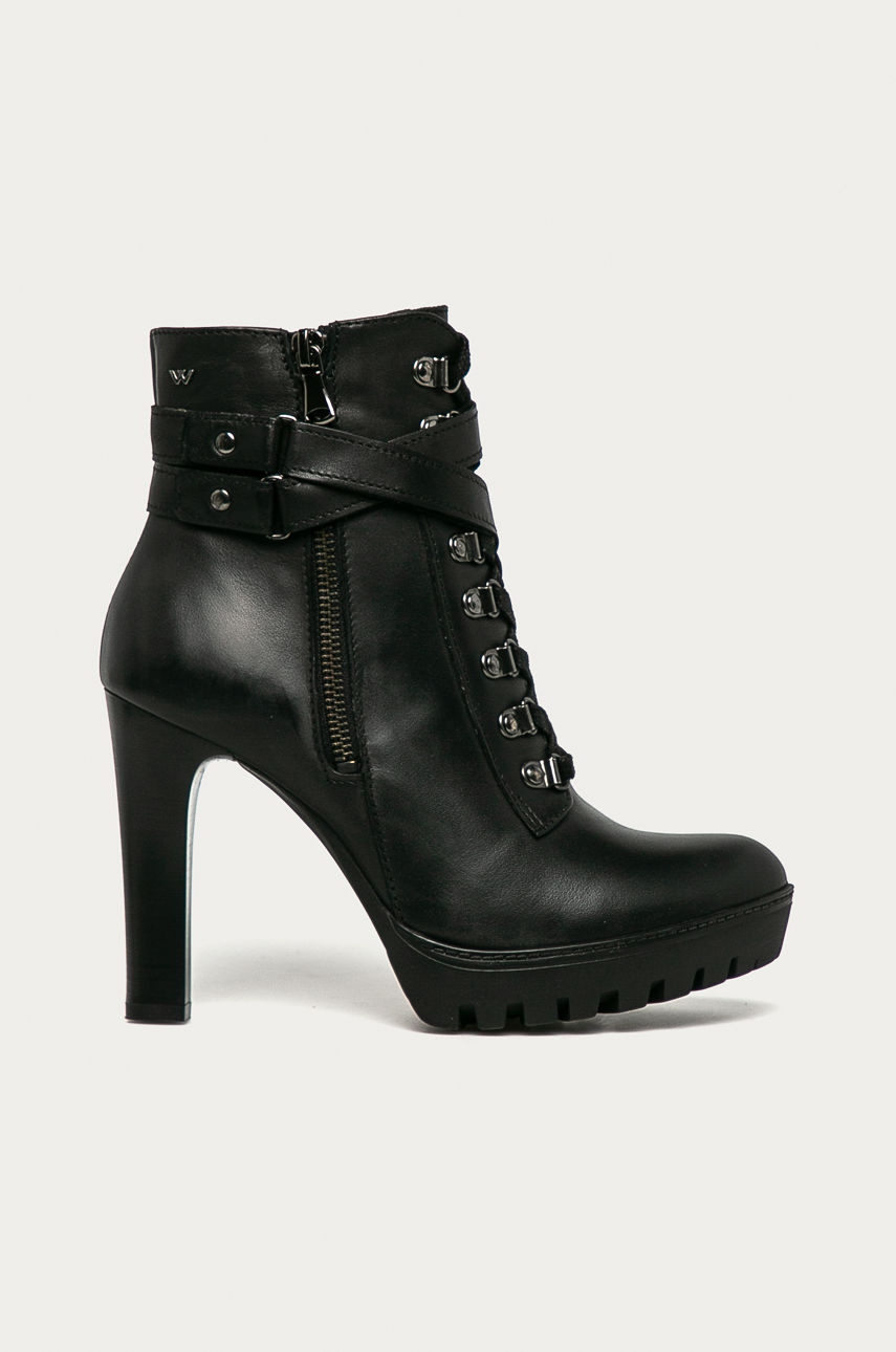 Botki z kolekcji Wojas. Model wykonany ze skóry naturalnej. – Zapięcie na suwak. – Usztywniony nosek. – Gumowa podeszwa. – Skórzane wnętrze. – Model na stabilnym obcasie. – Wysokość obcasa: 10,5 cm. – Długość wkładki wynosi: 23,5 cm. – Wymiary podane dla rozmiaru: 37. Obcas: szpilka Ocieplenie: nieocieplane Materiał: skóra licowa Wysokość obcasa: powyżej 8 cm Zapięcie: sznurowanie Zapięcie: na zamek Skład: Cholewka: Skóra naturalna, Wnętrze: Skóra naturalna, Podeszwa: Materiał syntetyczny ID produktu: -100-OBD09D Kod producenta: 6401151