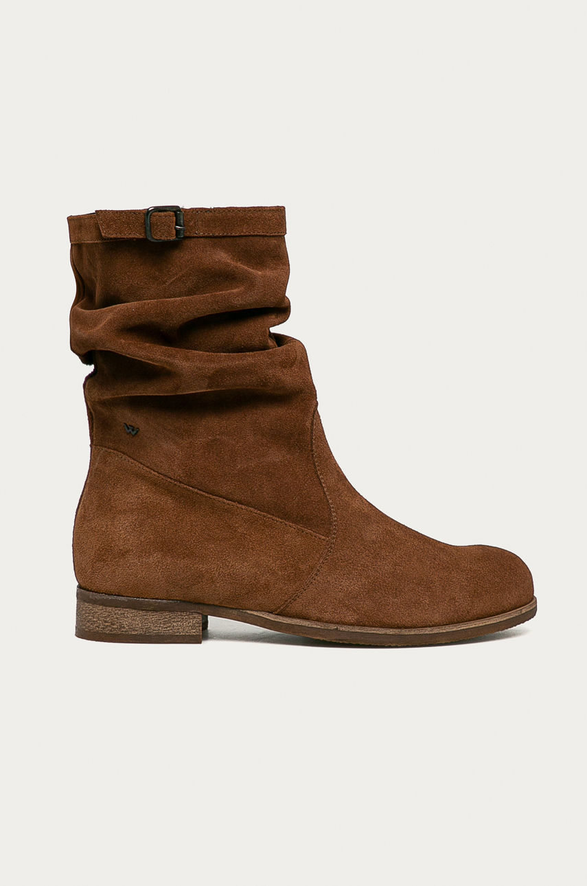 Botki z kolekcji Wojas. Model wykonany ze skóry zamszowej. – Okrągły, usztywniony nosek. – Mocno usztywniony zapiętek. – Gumowa podeszwa. – Tekstylne wnętrze. – Długość wkładki wynosi: 23,5 cm. – Wymiary podane dla rozmiaru: 37. Materiał: skóra zamszowa Obcas: płaski Ocieplenie: lekko ocieplane Zapięcie: brak zapięcia Wysokość obcasa: bez obcasa Skład: Cholewka: Skóra zamszowa, Wnętrze: Materiał syntetyczny, Podeszwa: Materiał syntetyczny ID produktu: -100-OBD02D Kod producenta: 5503962